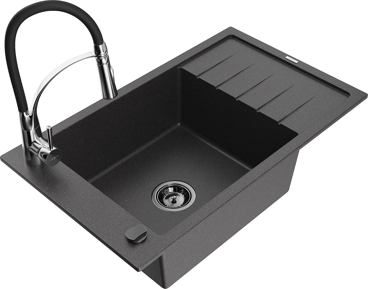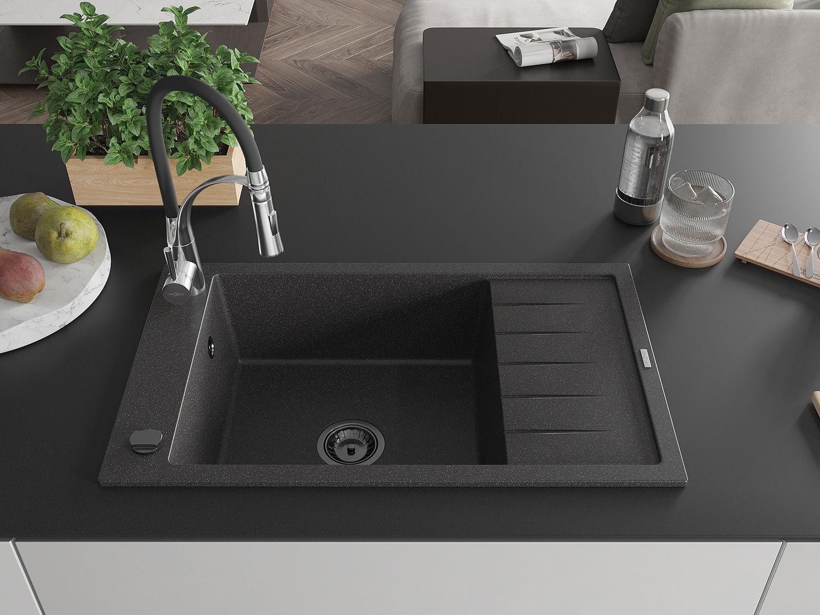 Mexen Elias granitový dřez s jednou komorou s odkapávačem a kuchyňskou baterií Aster, černý skvrnitý - 6511-76-73450-07-B