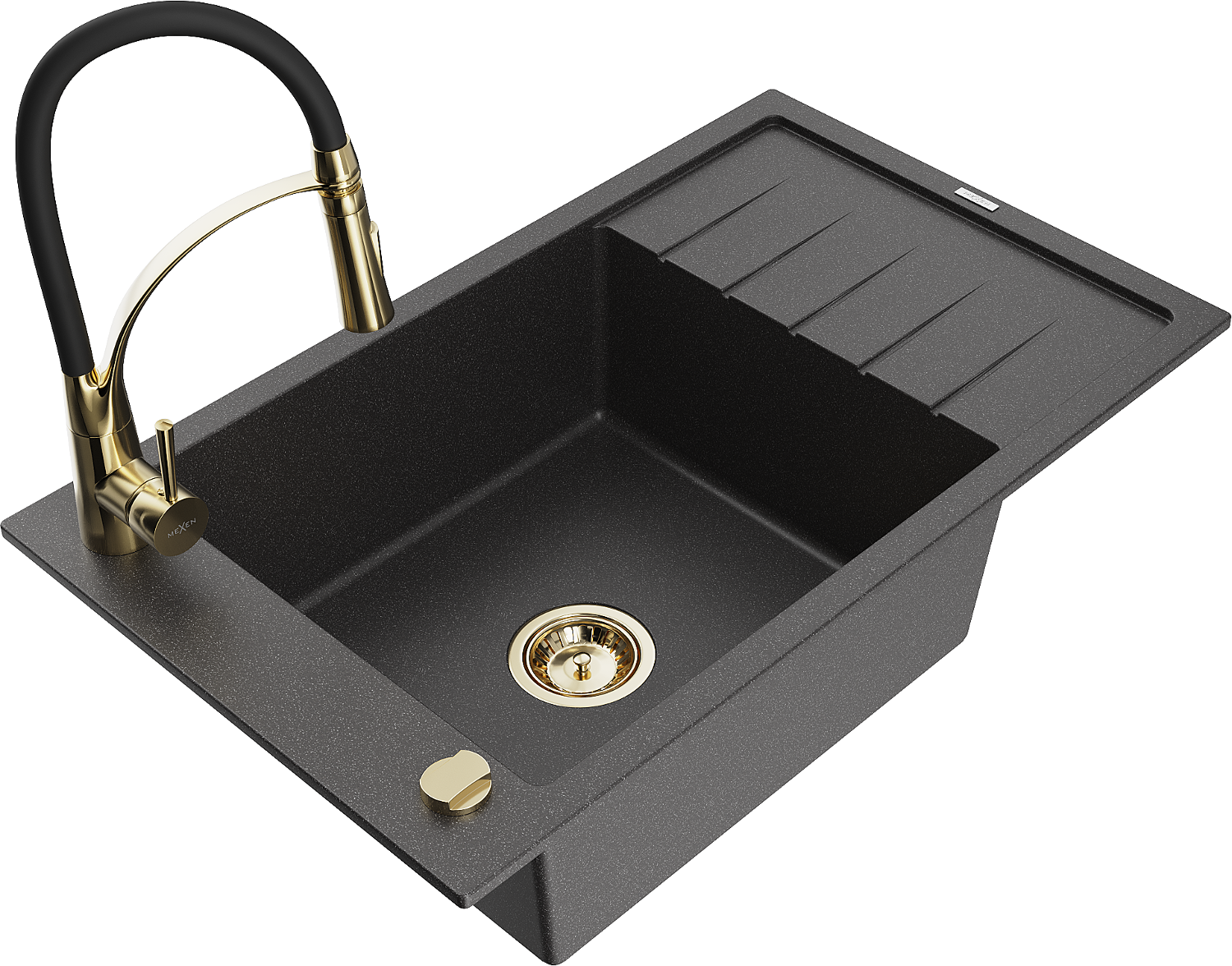 Mexen Elias granitový dřez 1-komorový s odkapem a kuchyňskou baterií Aster, černý s tečkami - 6511-76-73450-57-G
