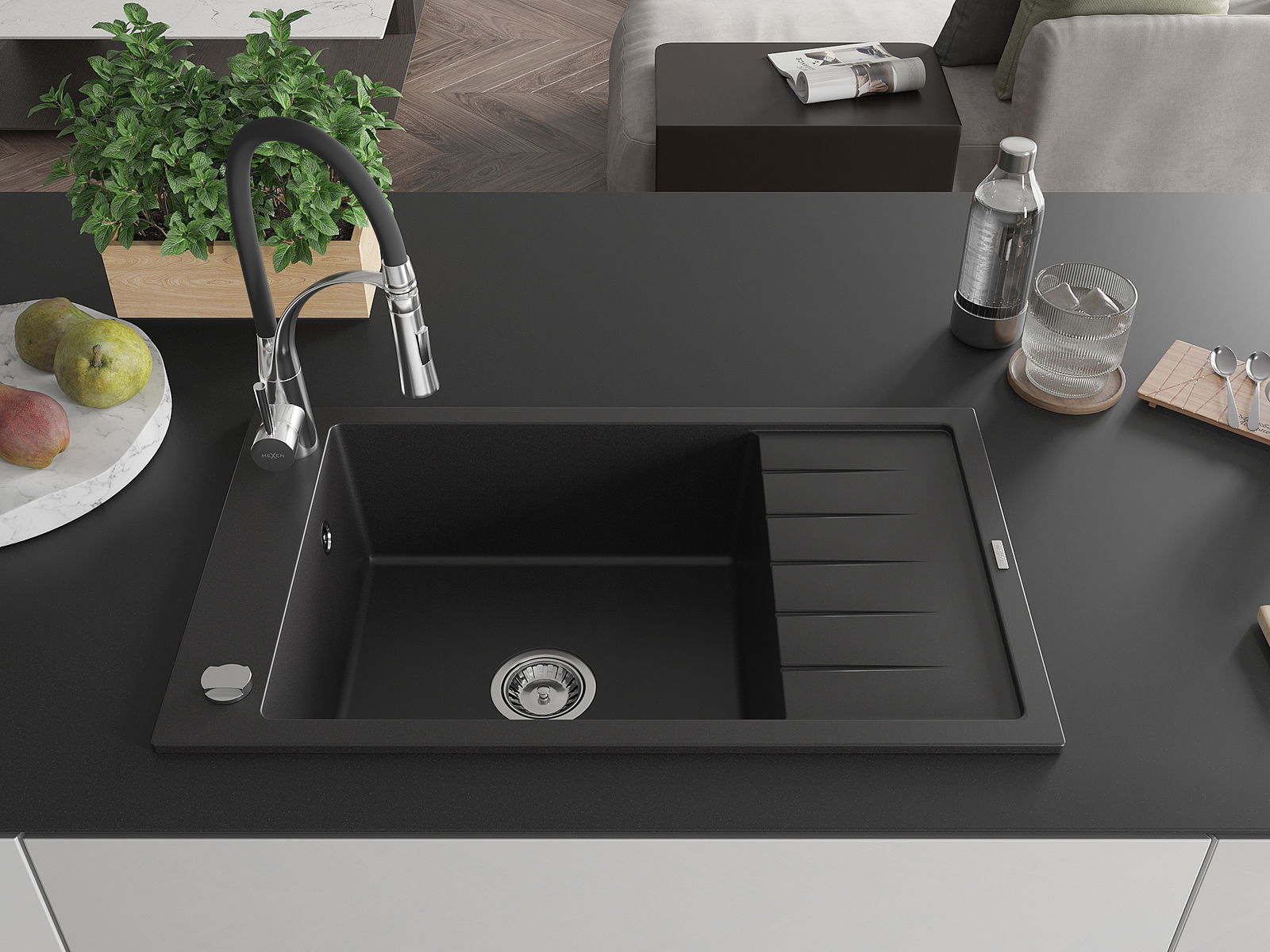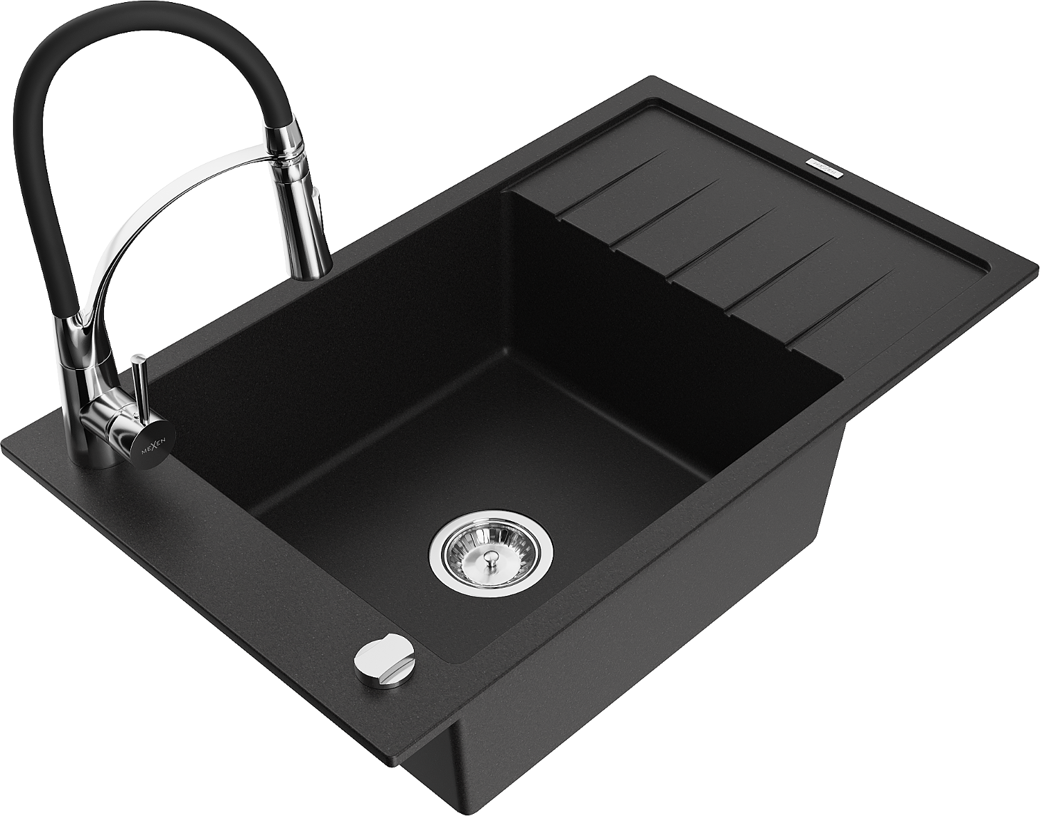 Mexen Elias granitový dřez 1-komorový s odkapávačem a kuchyňskou baterií Aster, černý - 6511-77-73450-07