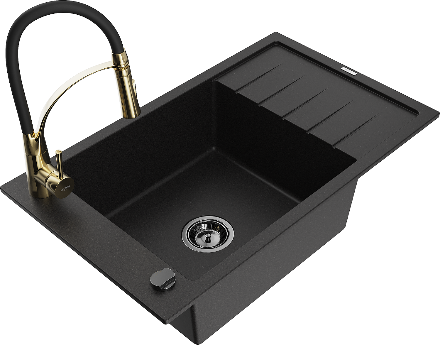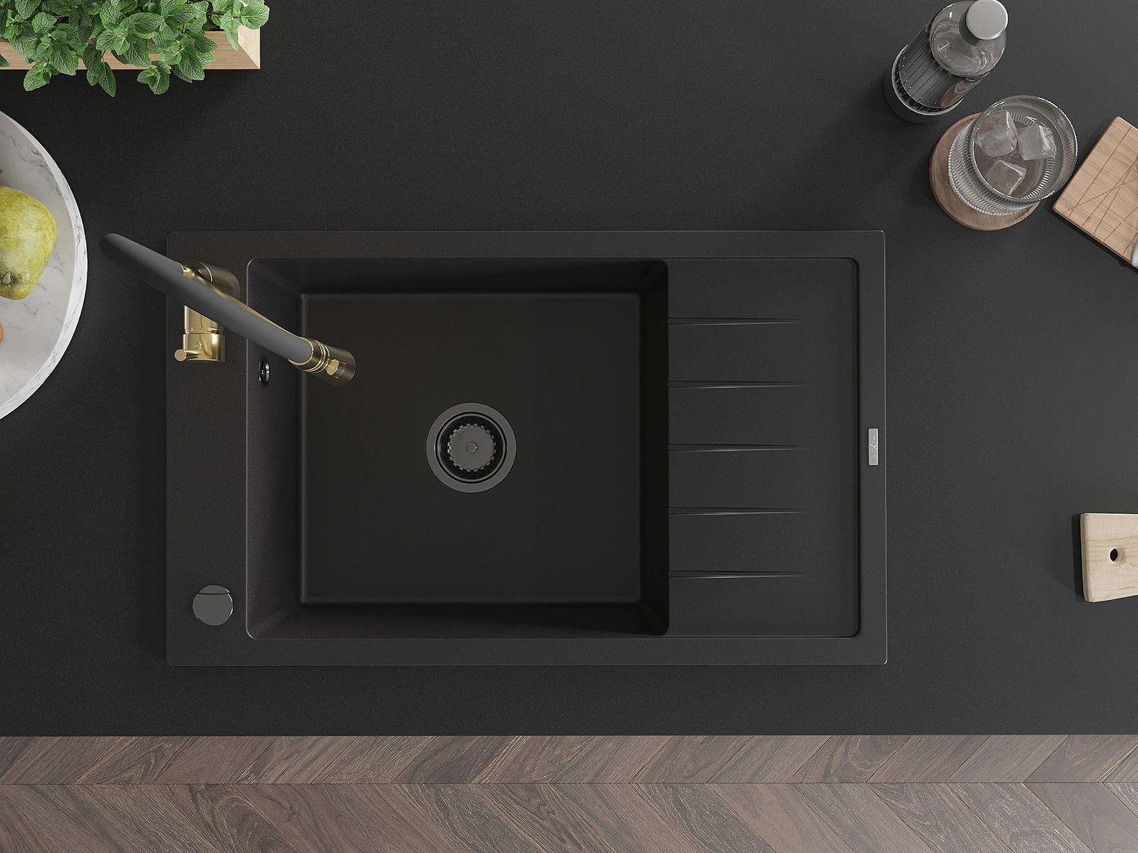 Mexen Elias granitový dřez s 1 komorou s odkapávačem a kuchyňskou baterií Aster, černý - 6511-77-73450-57-B