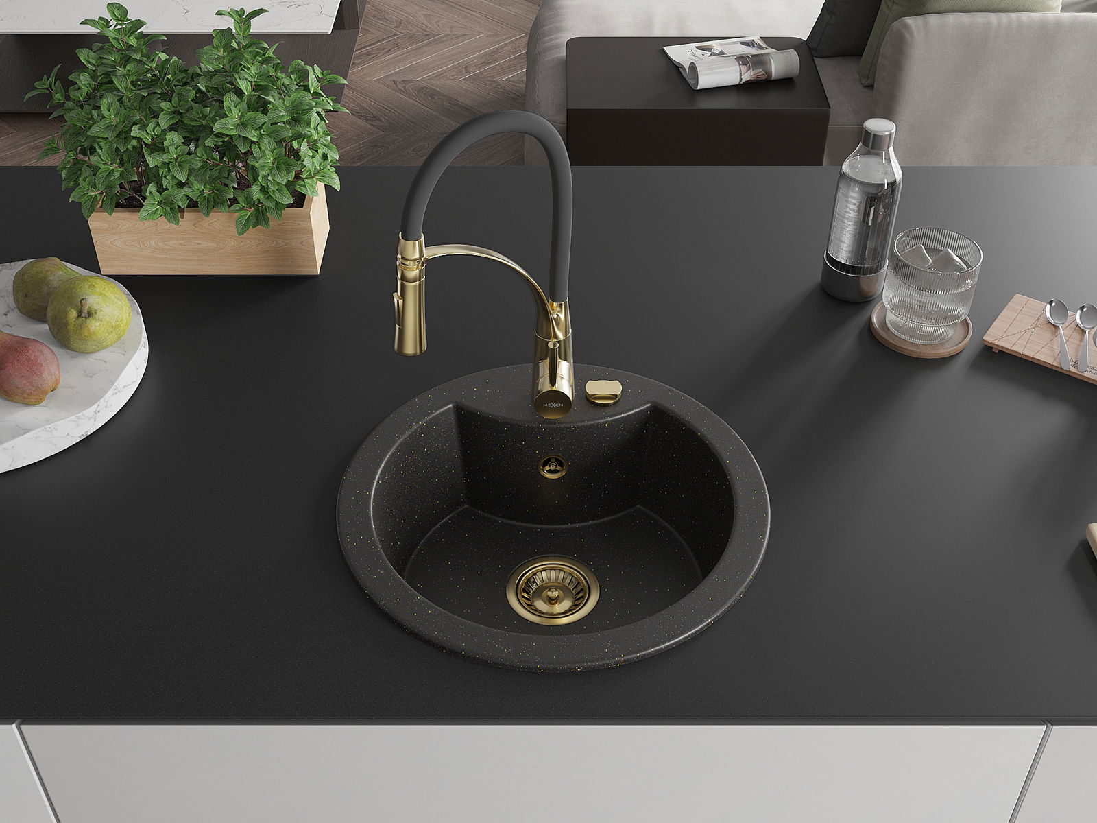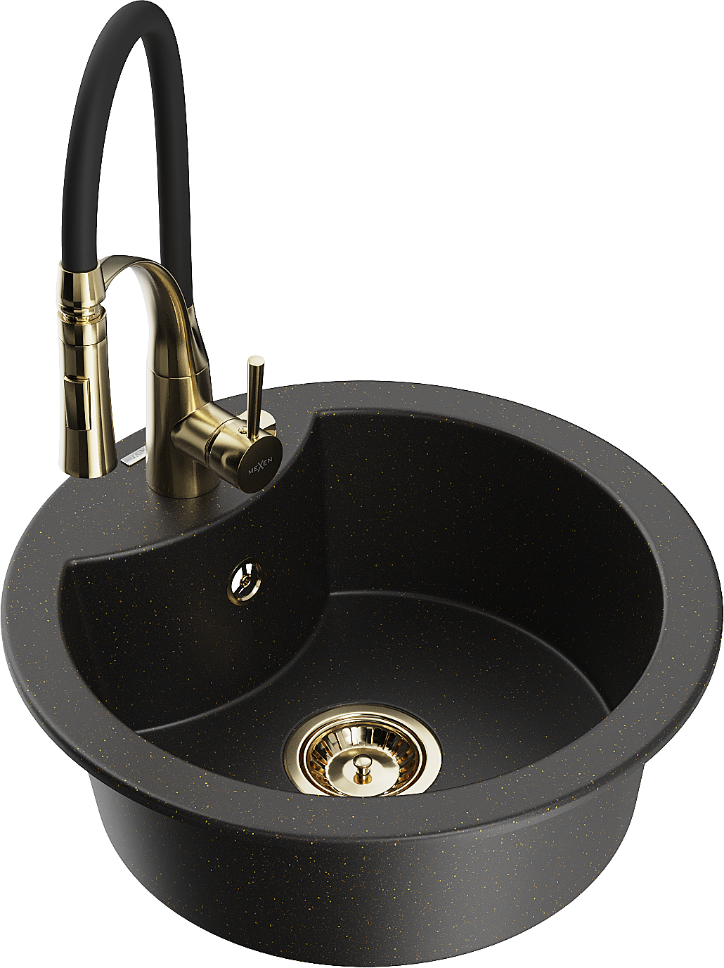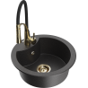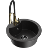 Mexen Diego granitový dřez 1-komorový s kuchyňskou baterií Aster, černý/zlatý metalik - 6512-75-73450-57-G