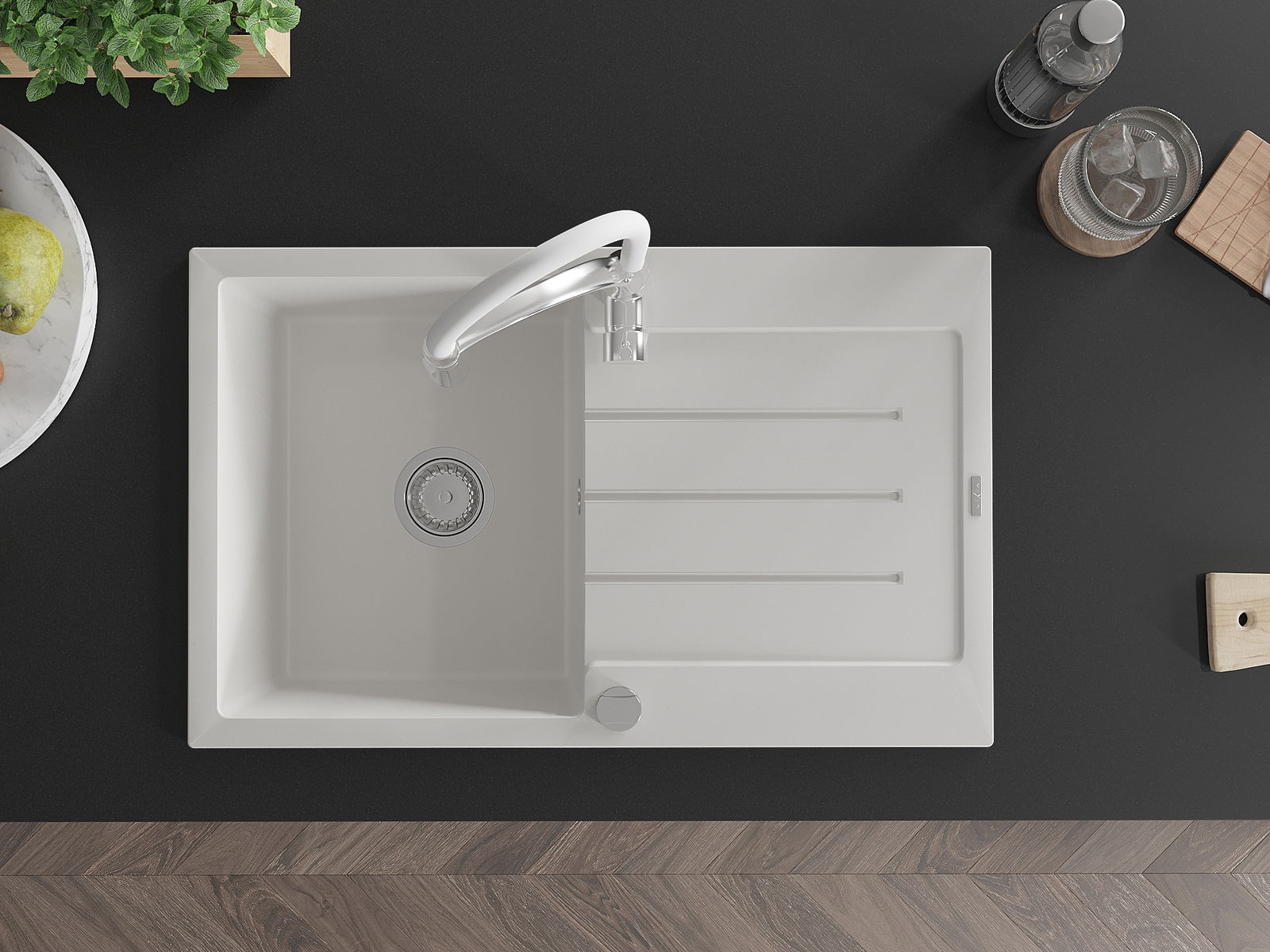 Mexen Bruno granitový dřez 1-komorový s odkapávačem a kuchyňskou baterií Aster, bílý - 6513-20-73450-02
