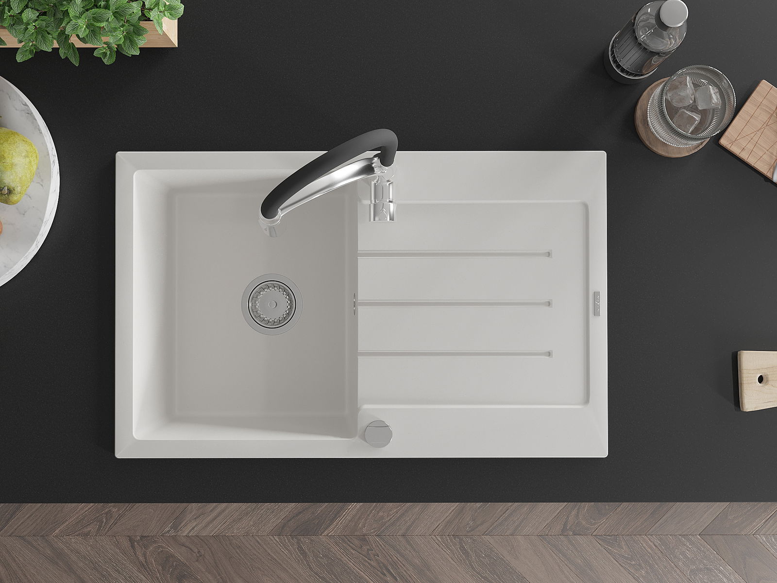 Mexen Bruno granitový dřez s 1 komorou s odkapávačem a kuchyňskou baterií Aster, bílý - 6513-20-73450-07