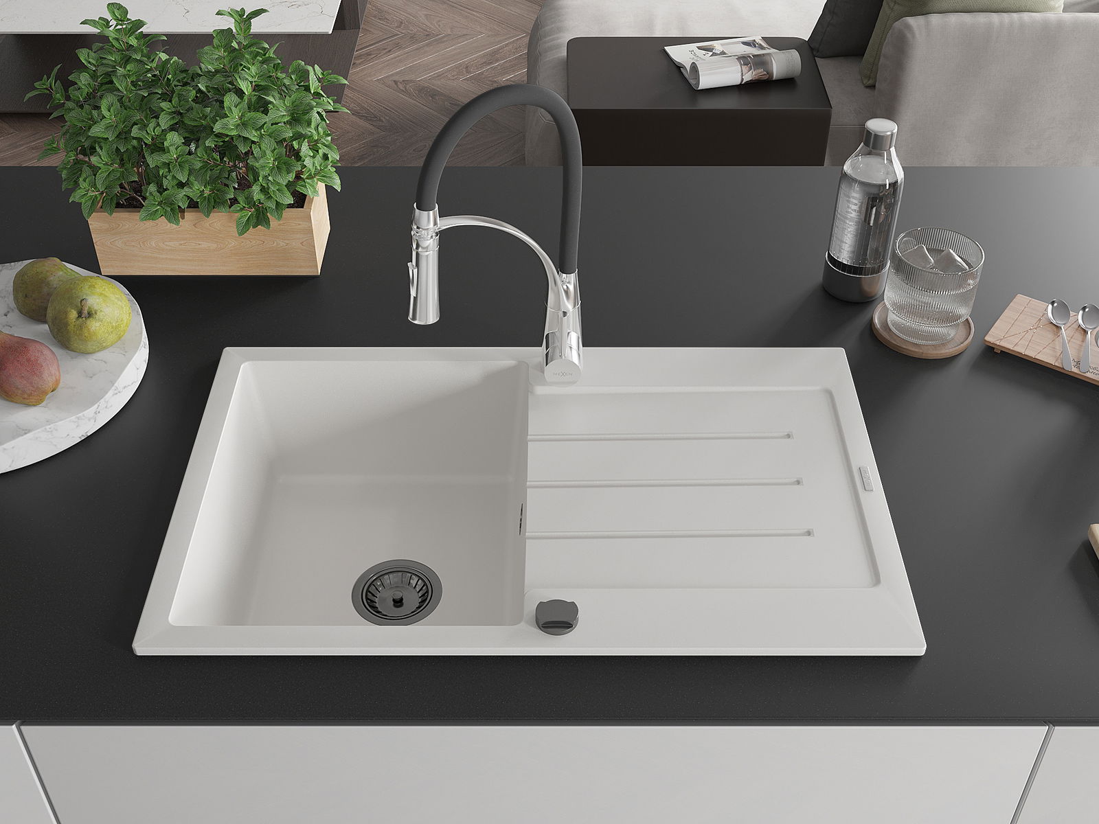 Mexen Bruno žulový dřez s 1 komorou, odkapávačem a kuchyňskou baterií Aster, bílý - 6513-20-73450-07-B
