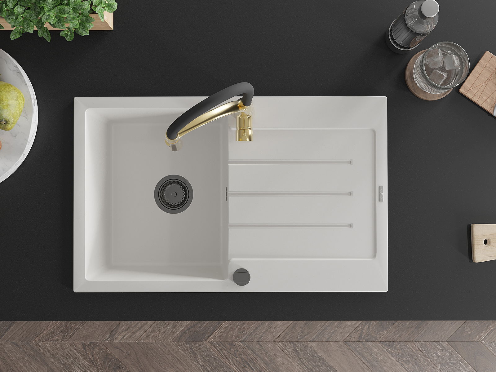 Mexen Bruno granitový dřez 1-komorový s odkapávačem a kuchyňskou baterií Aster, bílý - 6513-20-73450-57-B