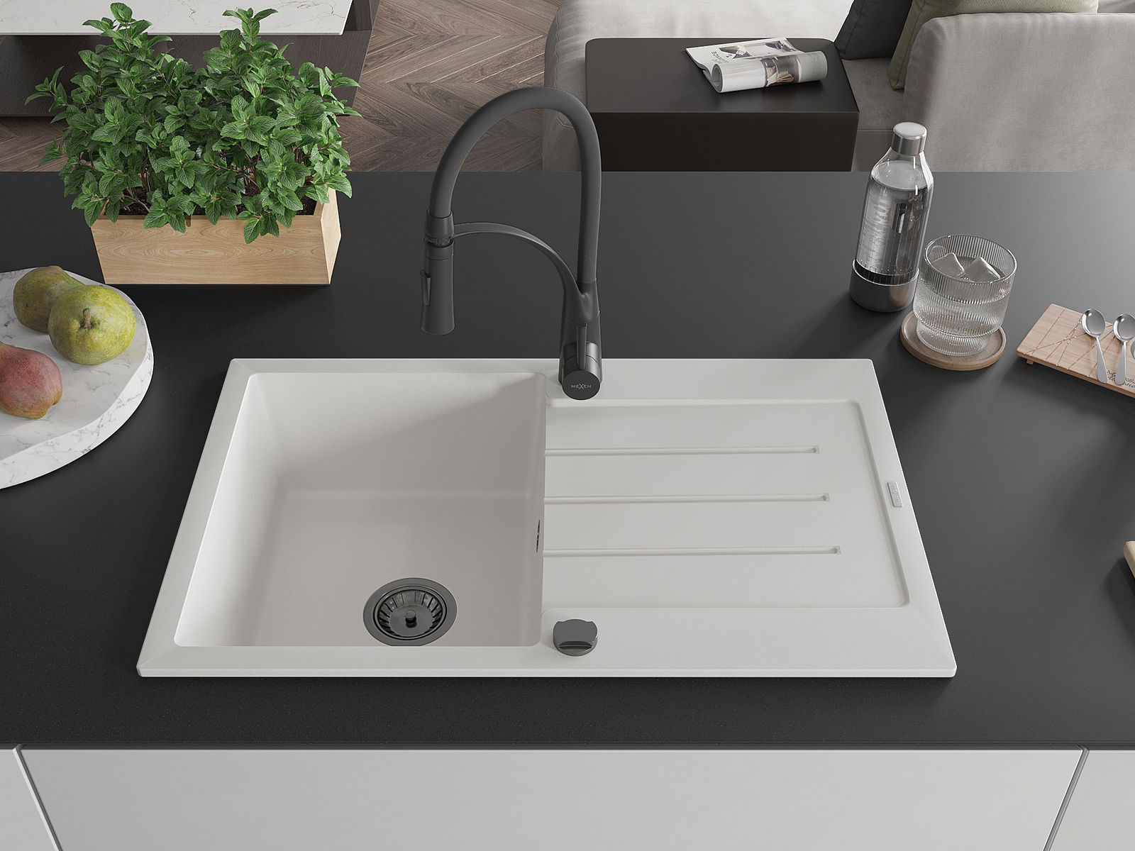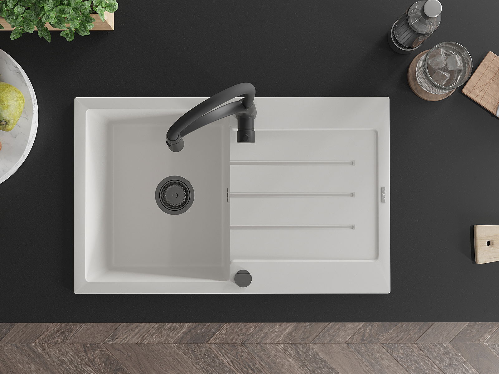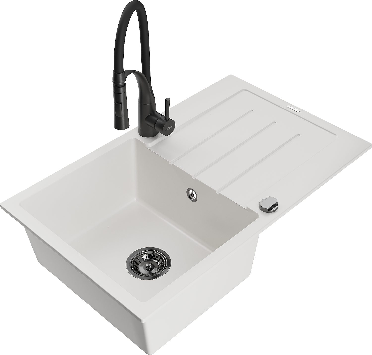 Mexen Bruno granitový dřez jednokomorový s odkapávačem a kuchyňskou baterií Aster, bílý - 6513-20-73450-70-B