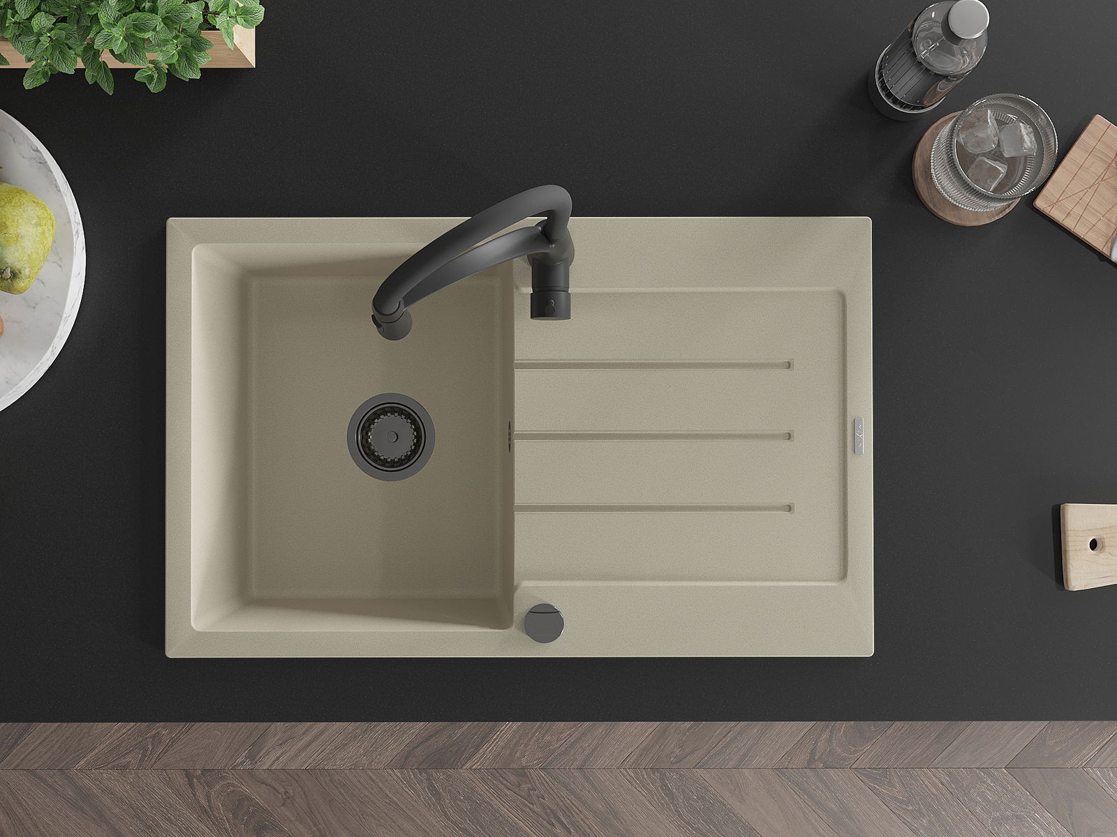 Mexen Bruno granitový dřez s 1 vanou a odkapávačem a kuchyňskou baterií Aster, béžový - 6513-69-73450-70-B