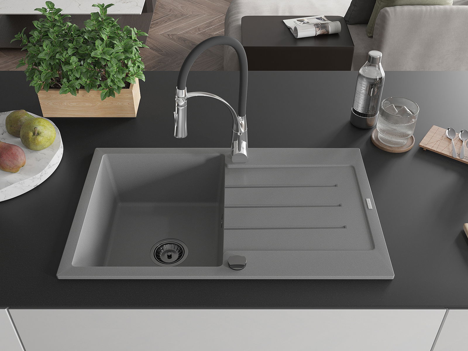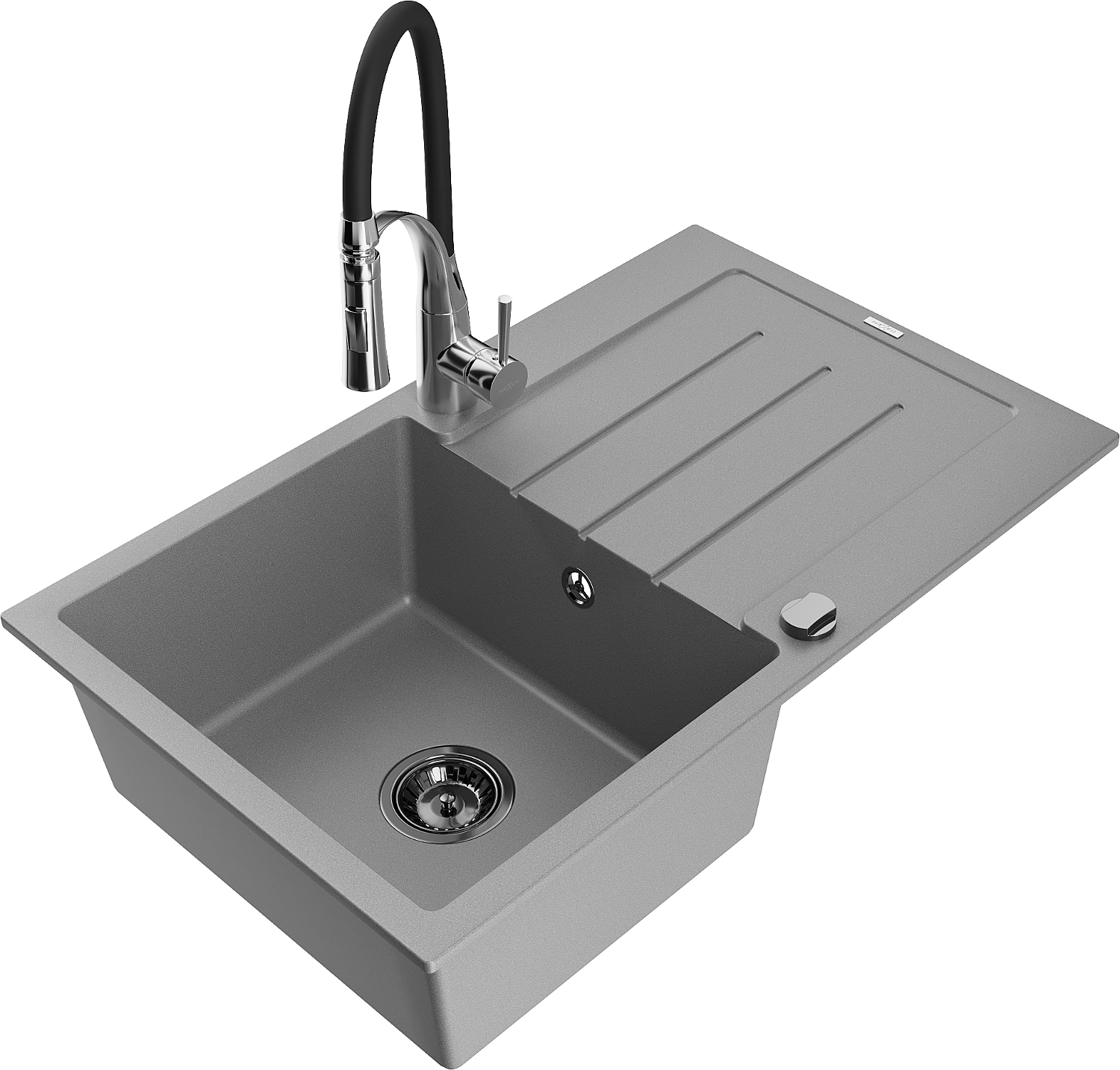 Mexen Bruno granitový dřez 1-komorový s odkapávačem a kuchyňskou baterií Aster, šedý - 6513-71-73450-07-B