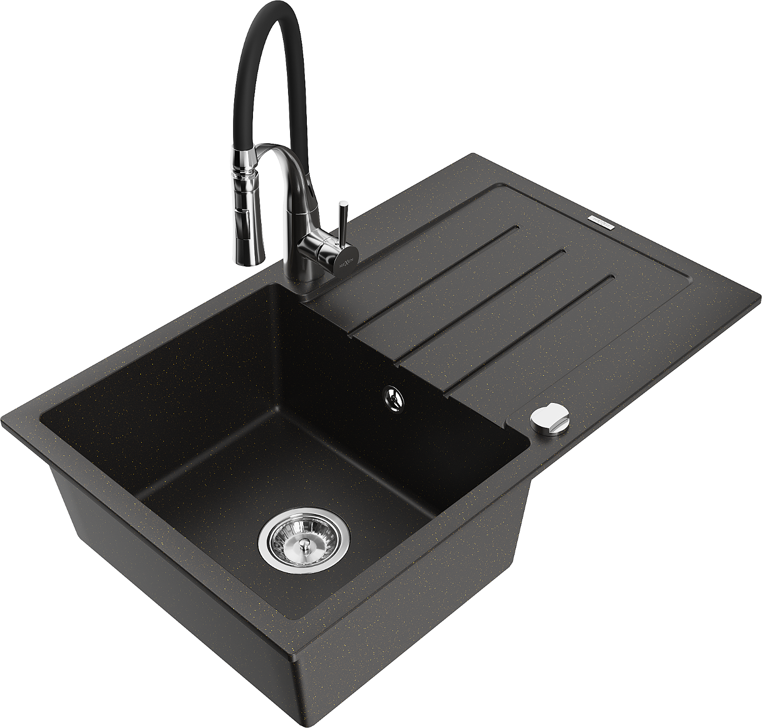 Mexen Bruno granitový dřez 1-komorový s odkapávačem a kuchyňskou baterií Aster, černý/zlatý metalik - 6513-75-73450-07