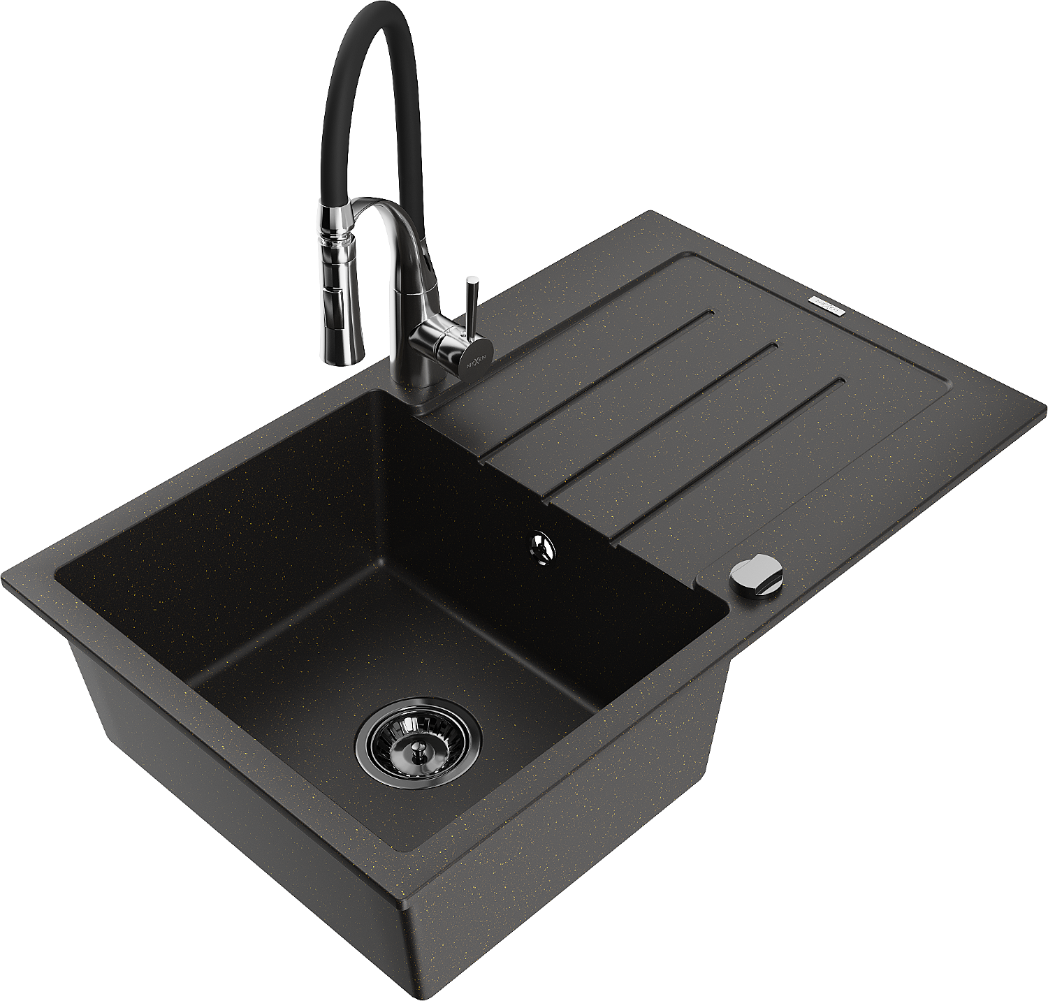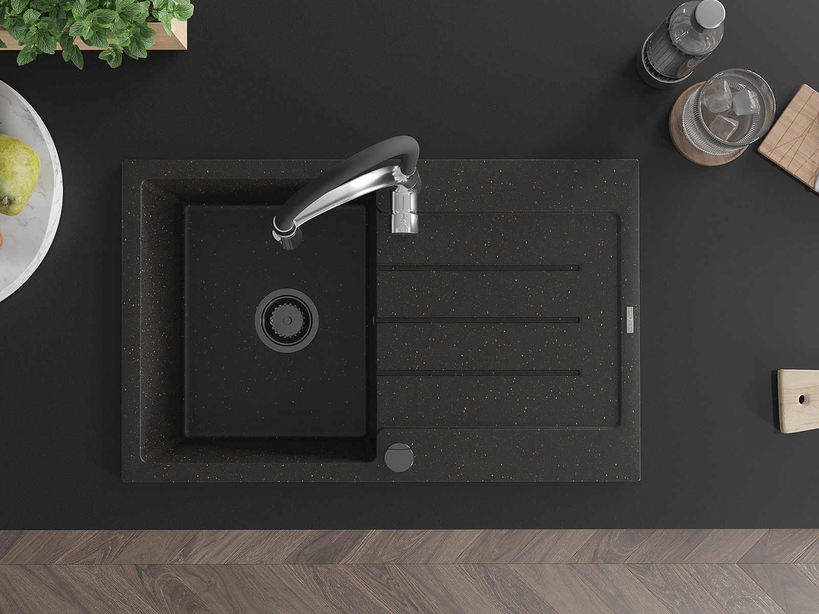 Mexen Bruno žulový dřez s 1 komorou, odkapávačem a kuchyňskou baterií Aster, černý/zlatý metalický - 6513-75-73450-07-B
