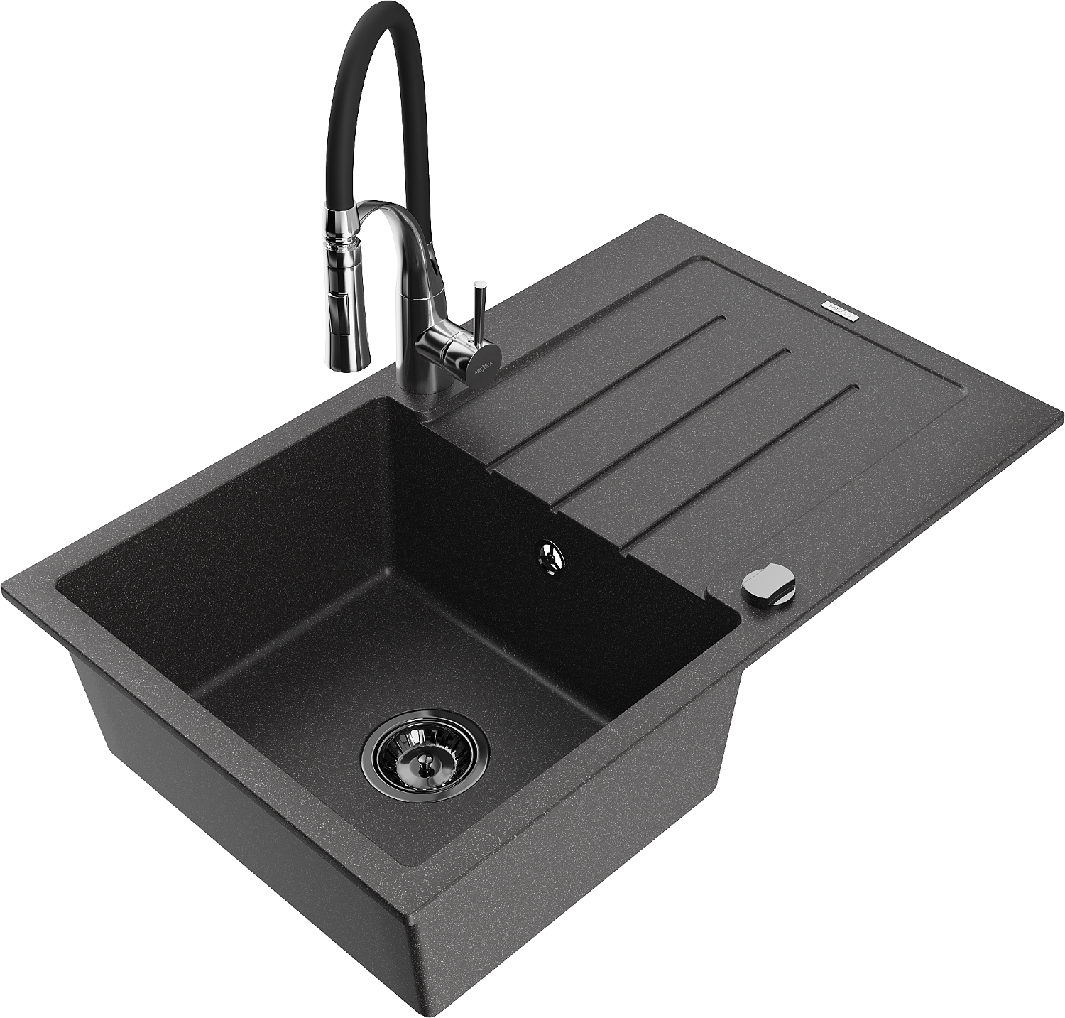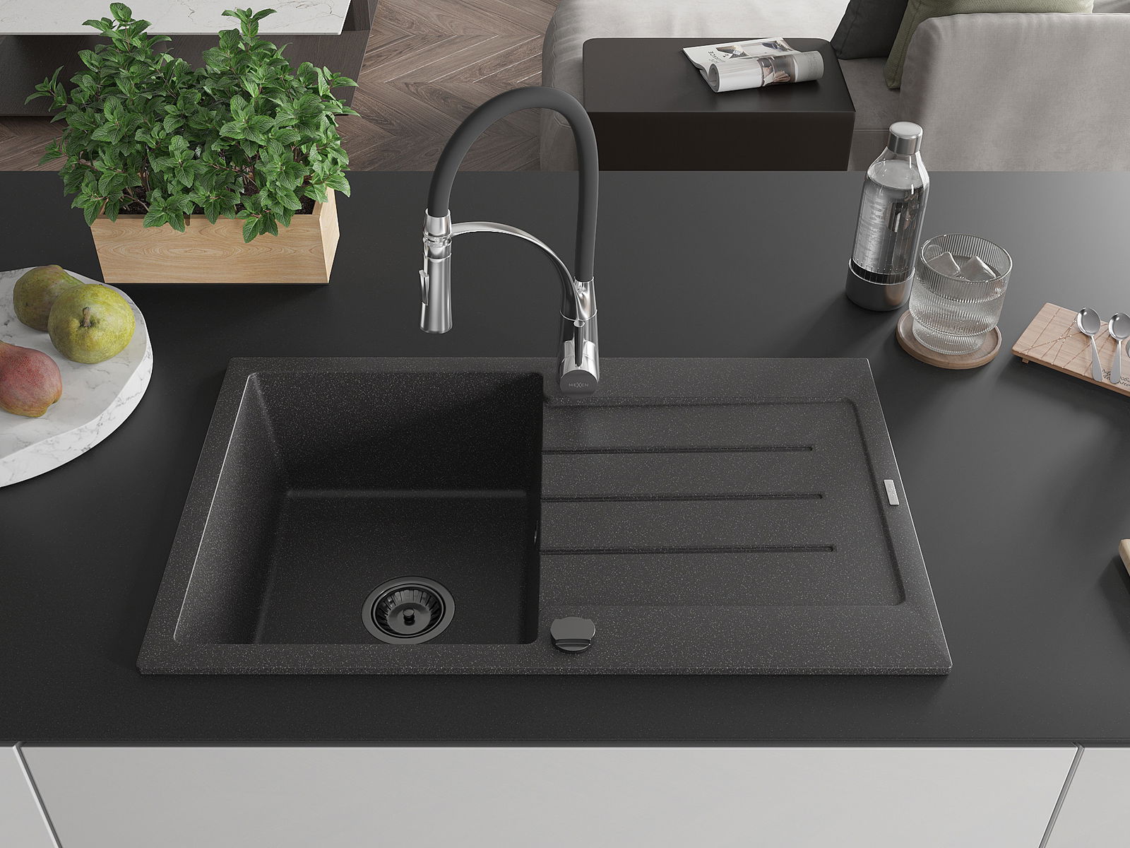 Mexen Bruno granitový dřez 1-komorový s odkapávačem a kuchyňskou baterií Aster, černý skvrnitý - 6513-76-73450-07-B