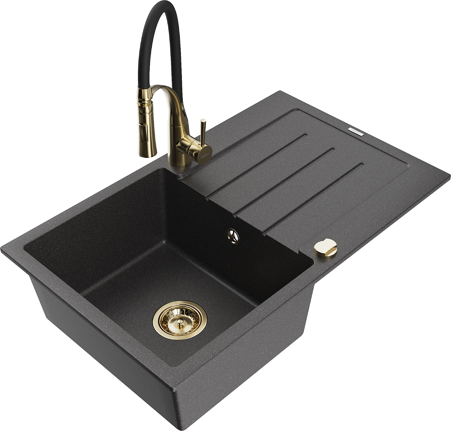 Mexen Bruno granitový dřez 1-komorový s odkapávačem a kuchyňskou baterií Aster, černý skvrnitý - 6513-76-73450-57-G