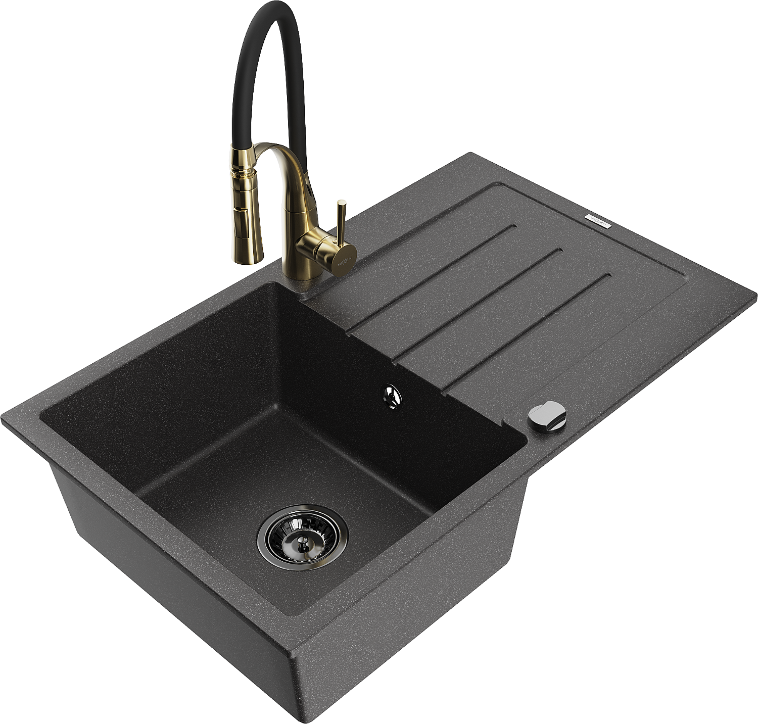 Mexen Bruno granitový dřez s 1 komorou a odkapávačem a kuchyňskou baterií Aster, černý nakrapovaný - 6513-76-73450-57-B