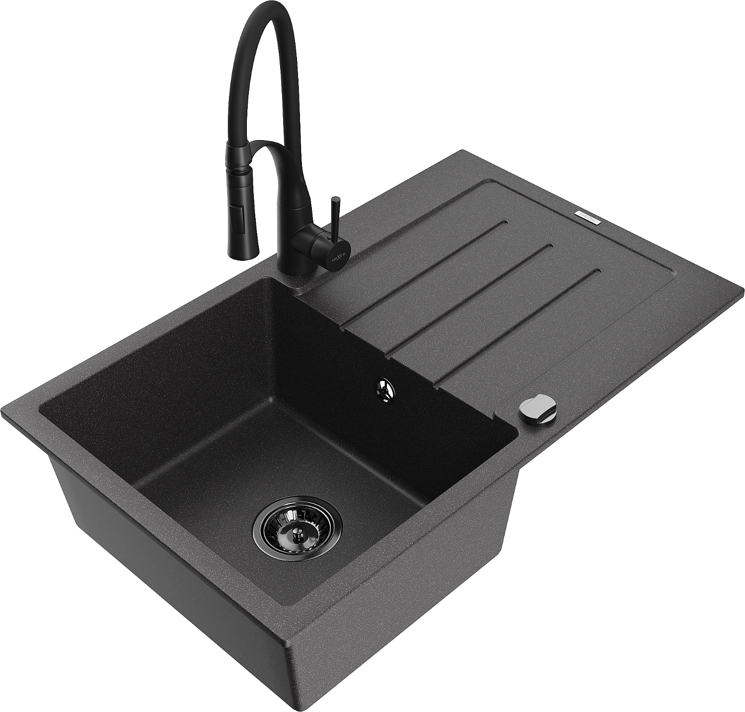 Mexen Bruno granitový dřez 1-komorový s odkapávačem a kuchyňskou baterií Aster, černý skvrnitý - 6513-76-73450-70-B