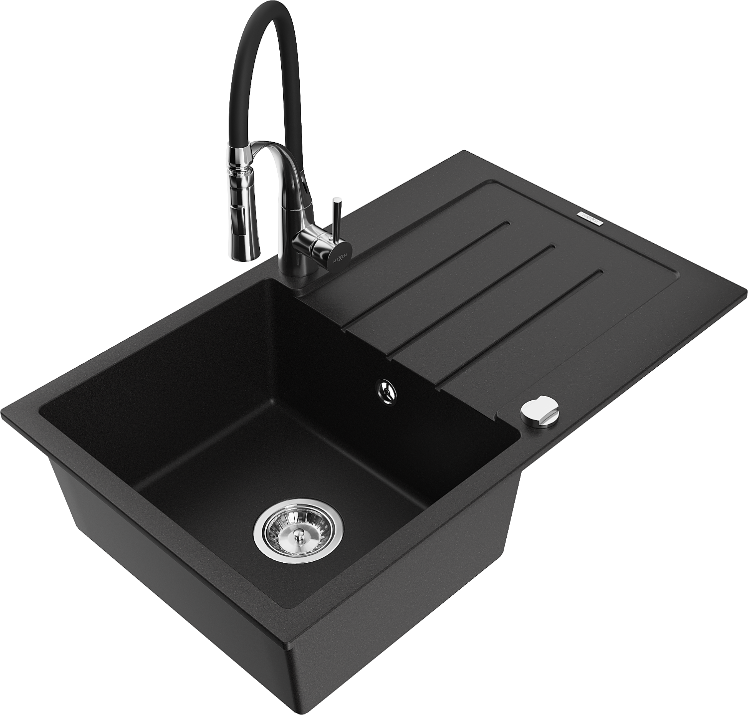 Mexen Bruno dřez žulový 1-komorový s odkapávačem a kuchyňskou baterií Aster, černý - 6513-77-73450-07