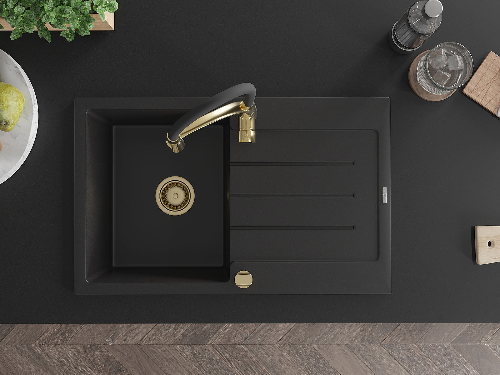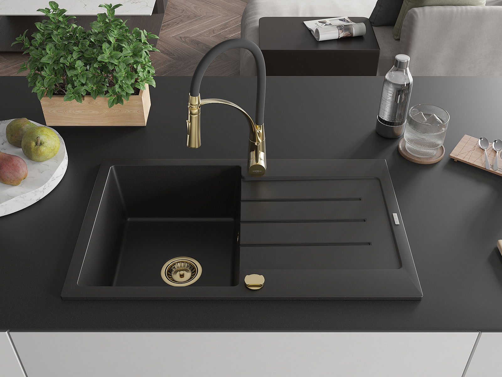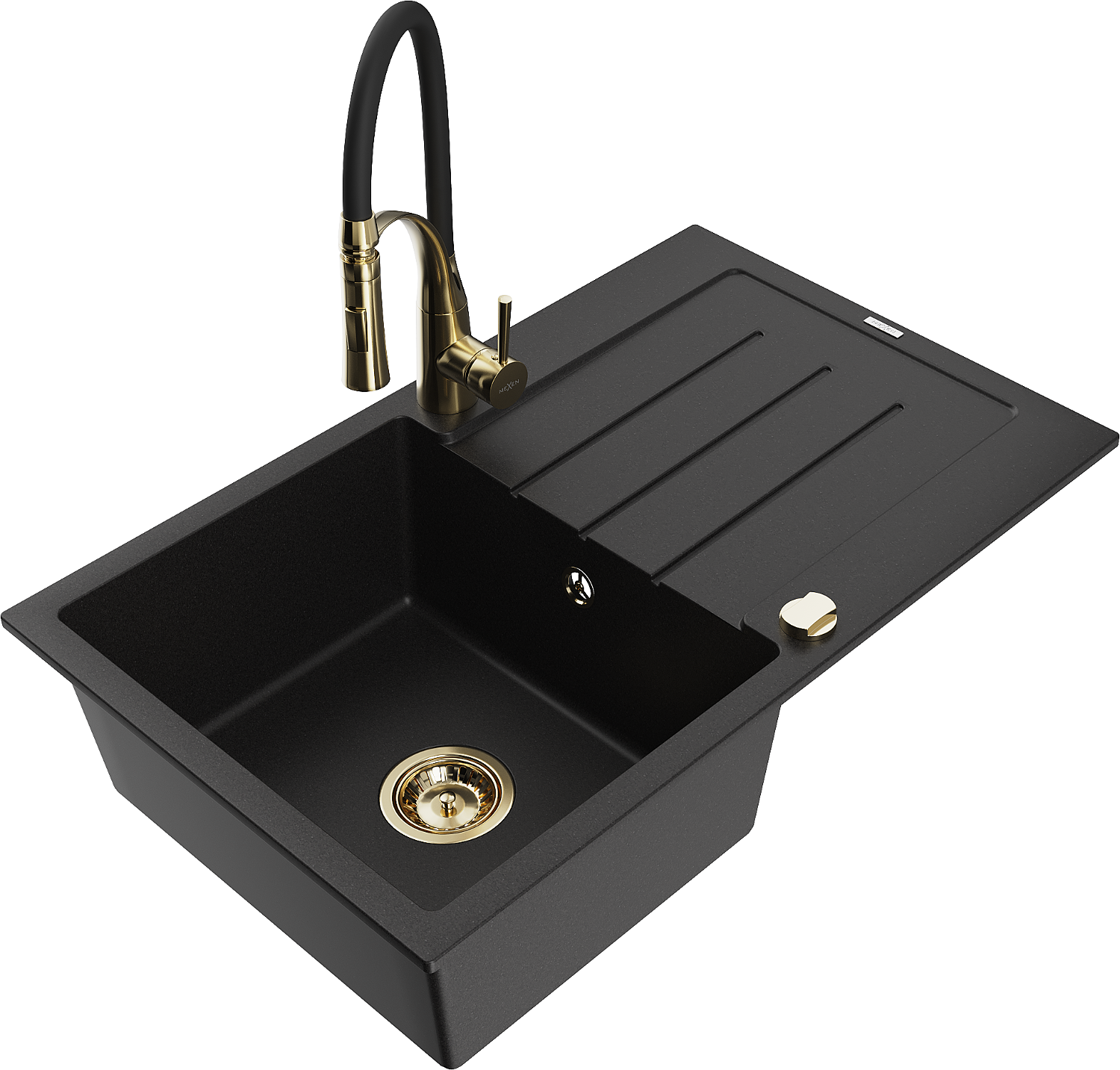 Mexen Bruno granitový dřez 1-komorový s odkapávačem a kuchyňskou baterií Aster, černý - 6513-77-73450-57-G