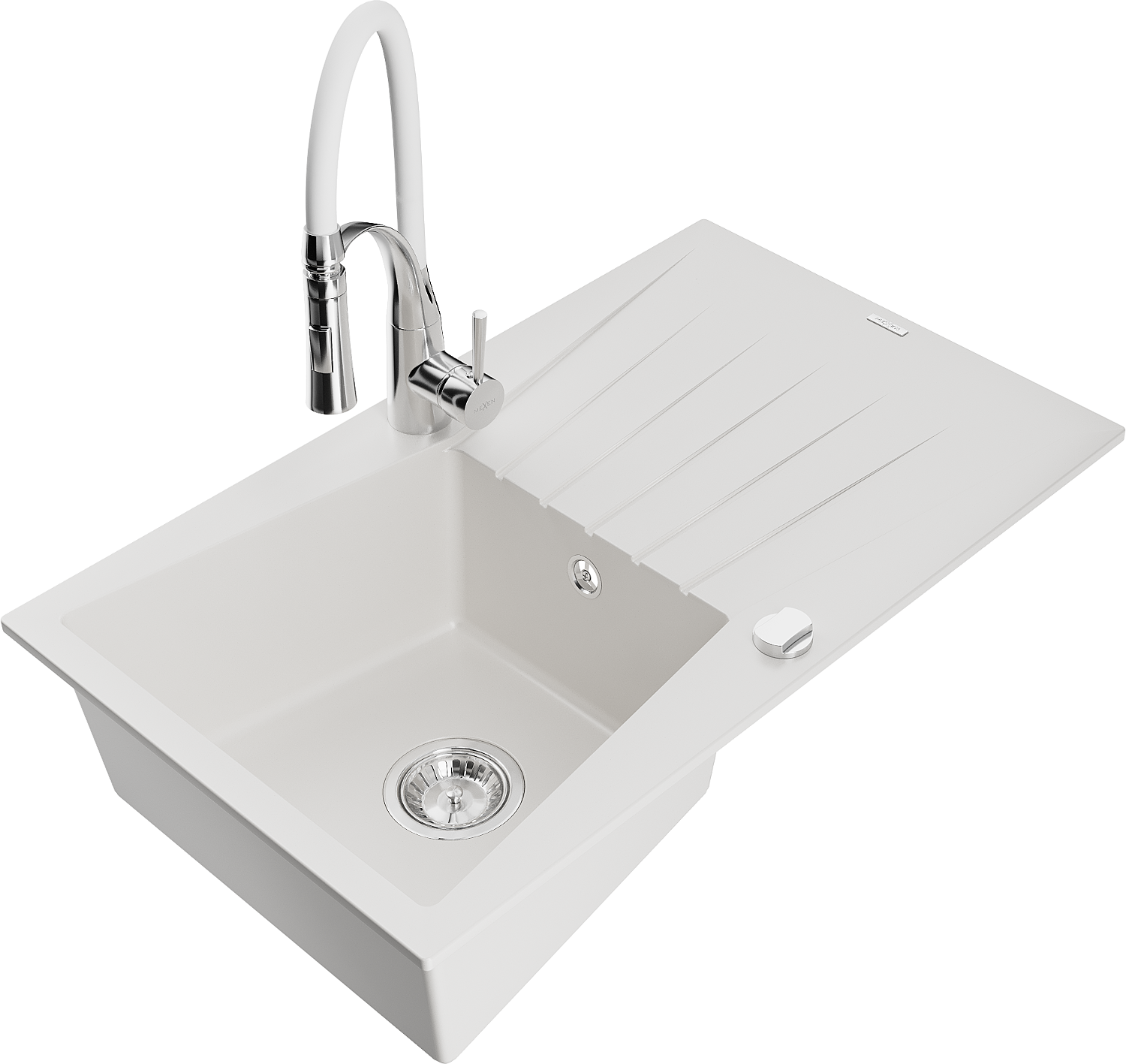 Mexen Cesar granitový dřez 1-komorový s odkapávačem a kuchyňskou baterií Aster, bílý - 6514-20-73450-02