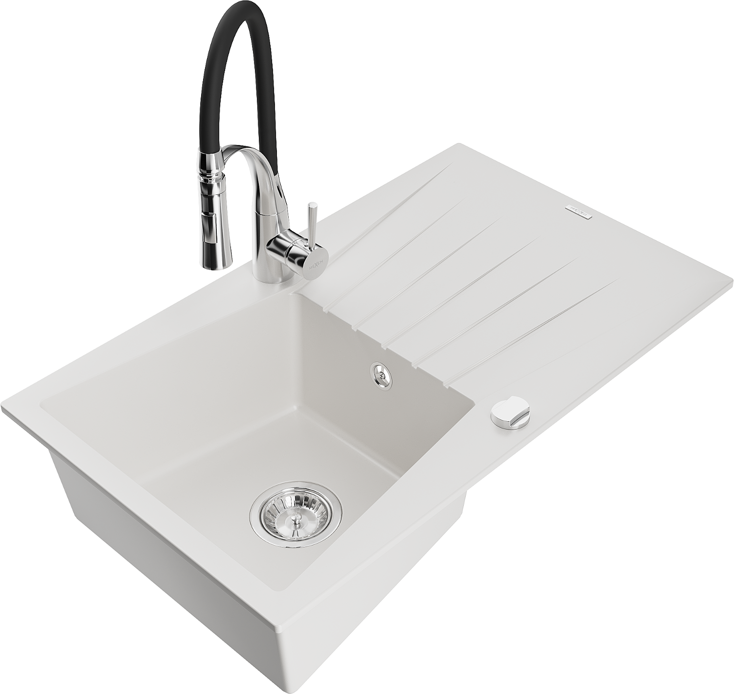 Mexen Cesar žulový dřez 1-komorový s odkapávačem a kuchyňskou baterií Aster, bílý - 6514-20-73450-07