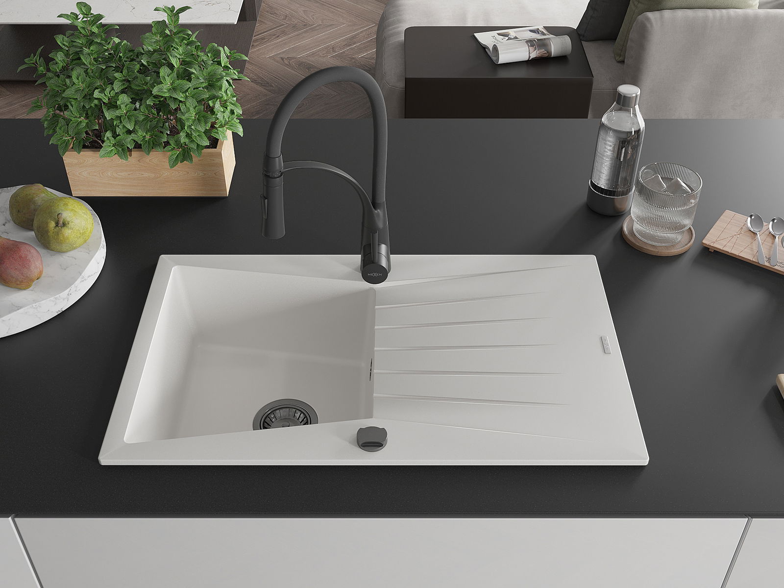 • Mexen Cesar granitový dřez 1-komorový s odkapávačem a kuchyňskou baterií Aster, bílý - 6514-20-73450-70-B