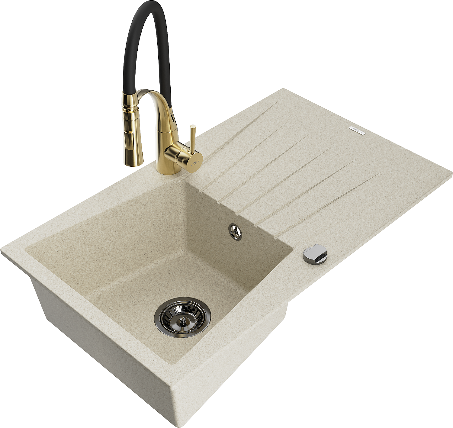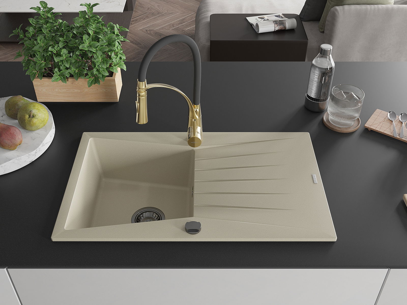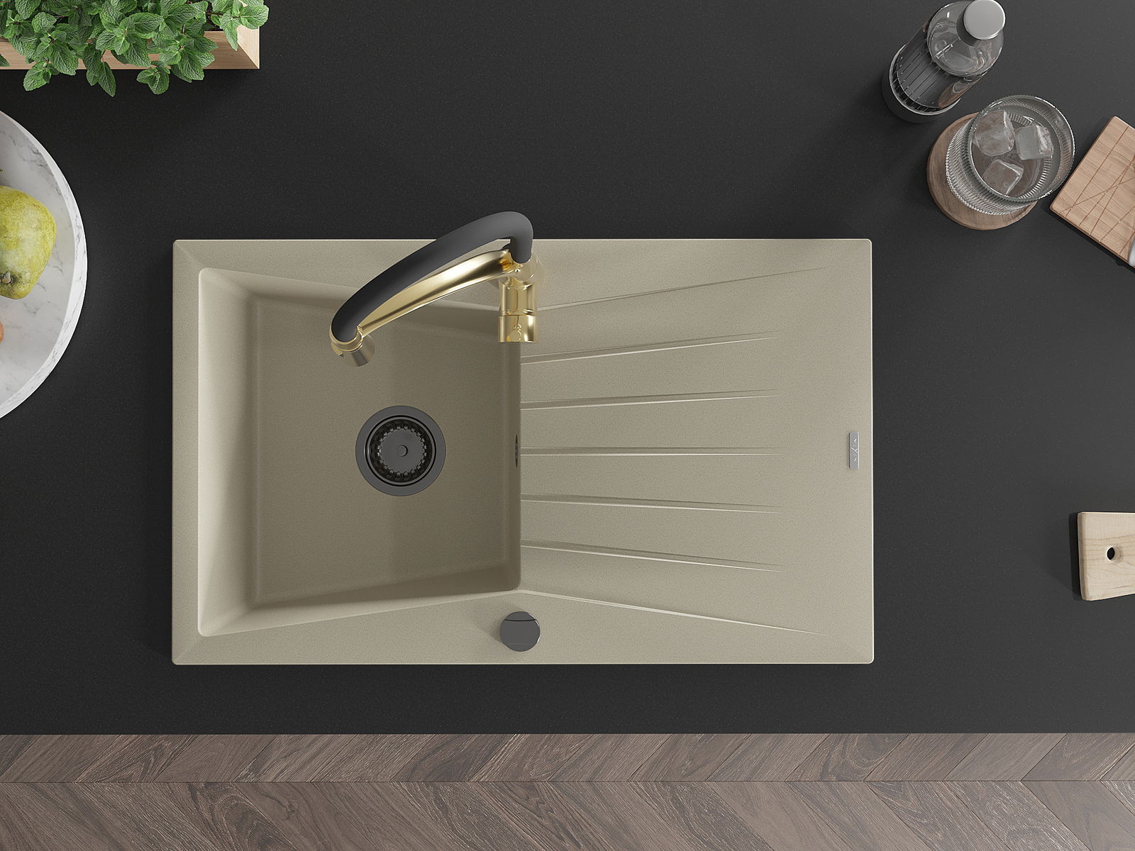 Mexen Cesar žulový dřez s 1 komorou a odkapávačem a kuchyňskou baterií Aster, béžový - 6514-69-73450-57-B