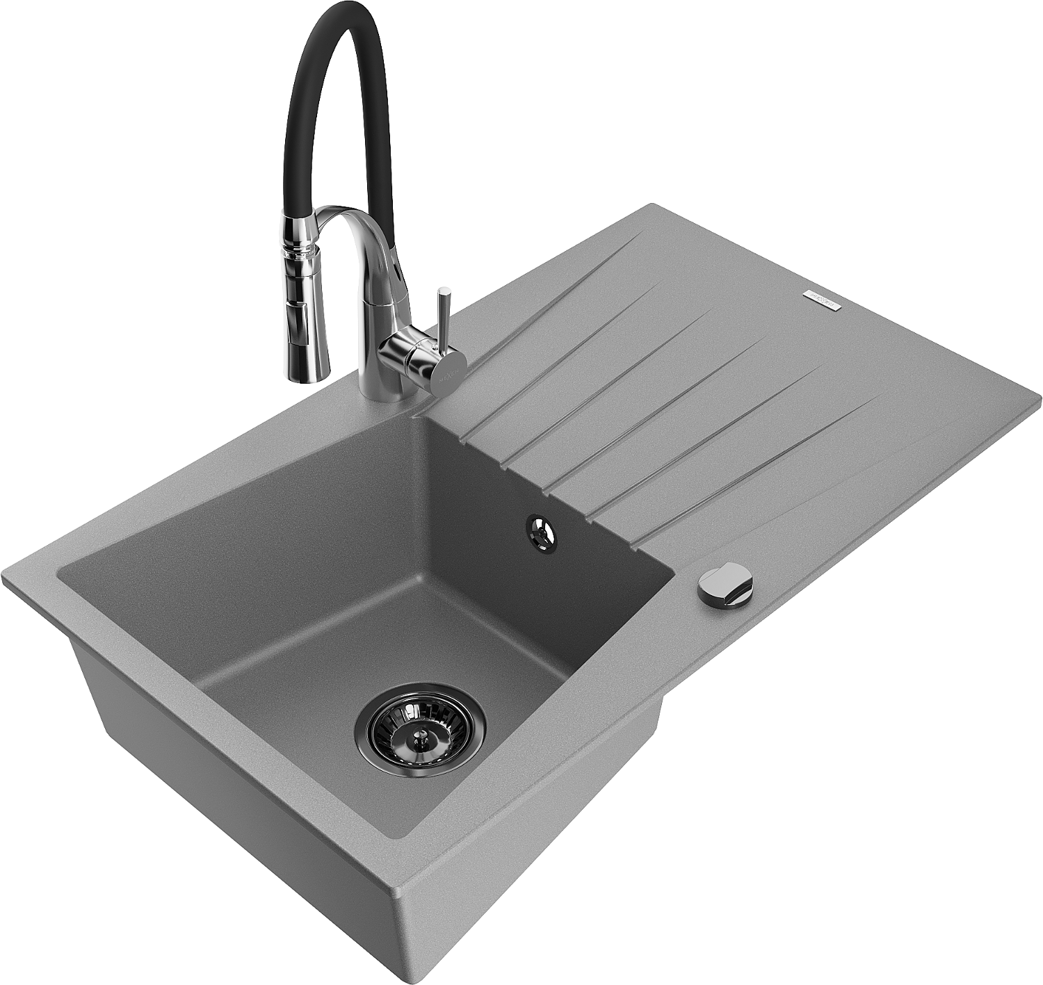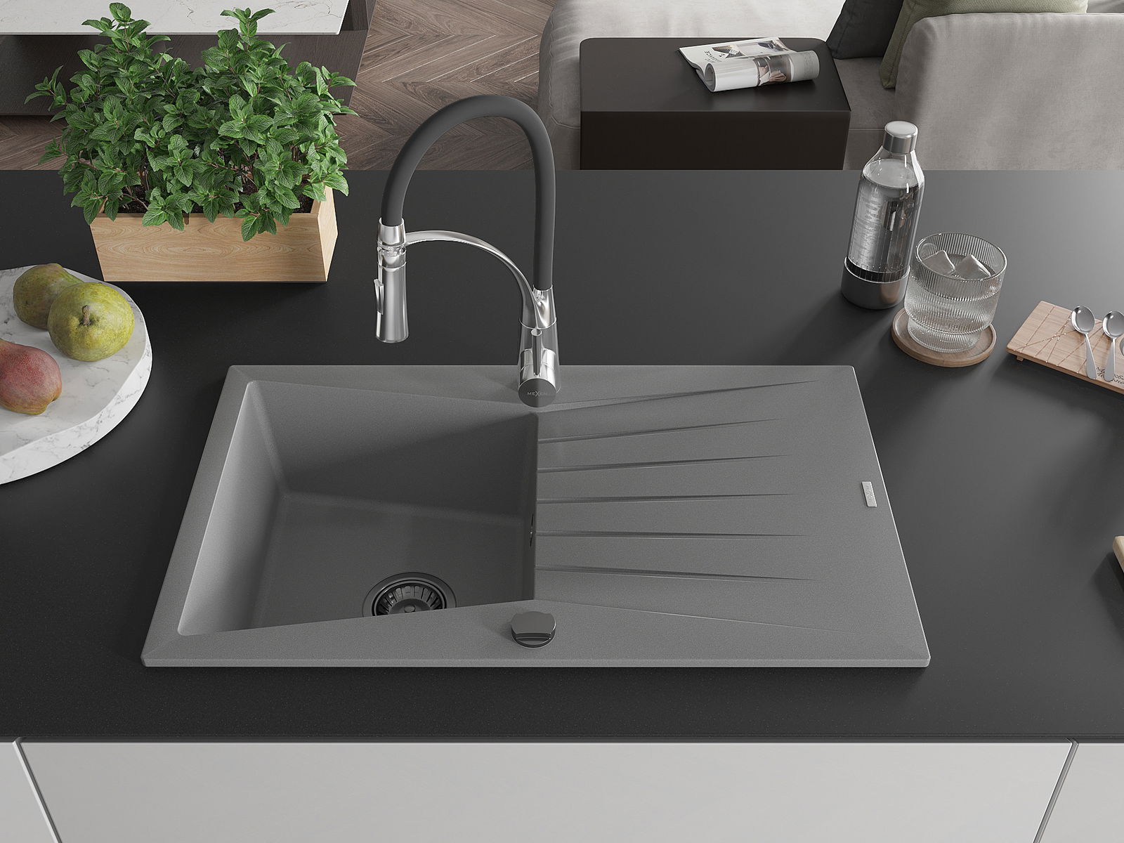 Mexen Cesar granitový dřez 1-komorový s odkapávačem a kuchyňskou baterií Aster, šedý - 6514-71-73450-07-B