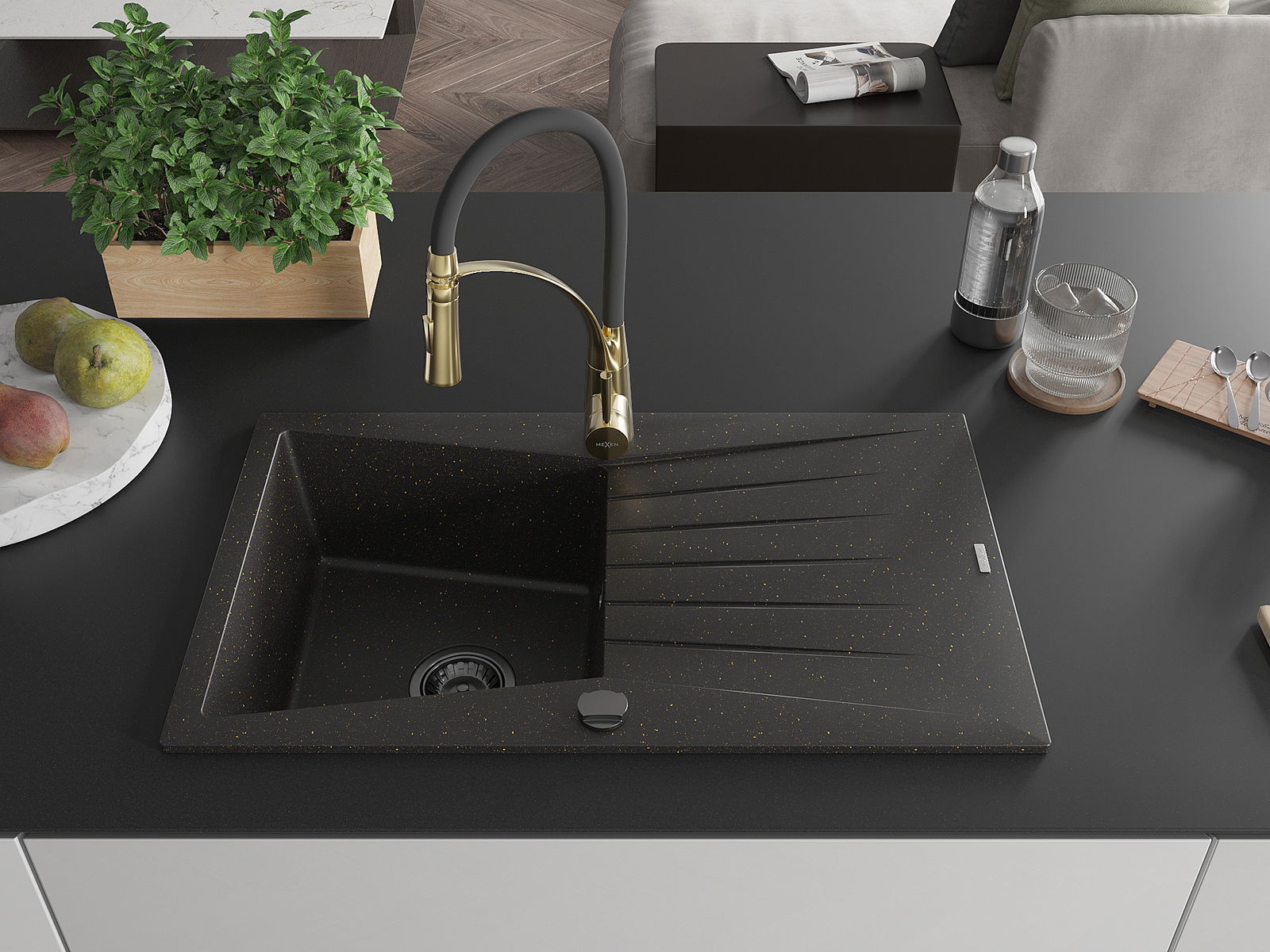 Mexen Cesar granitový kuchyňský dřez s jednou komorou, odkapávačem a baterií Aster, černý/zlatý metalický