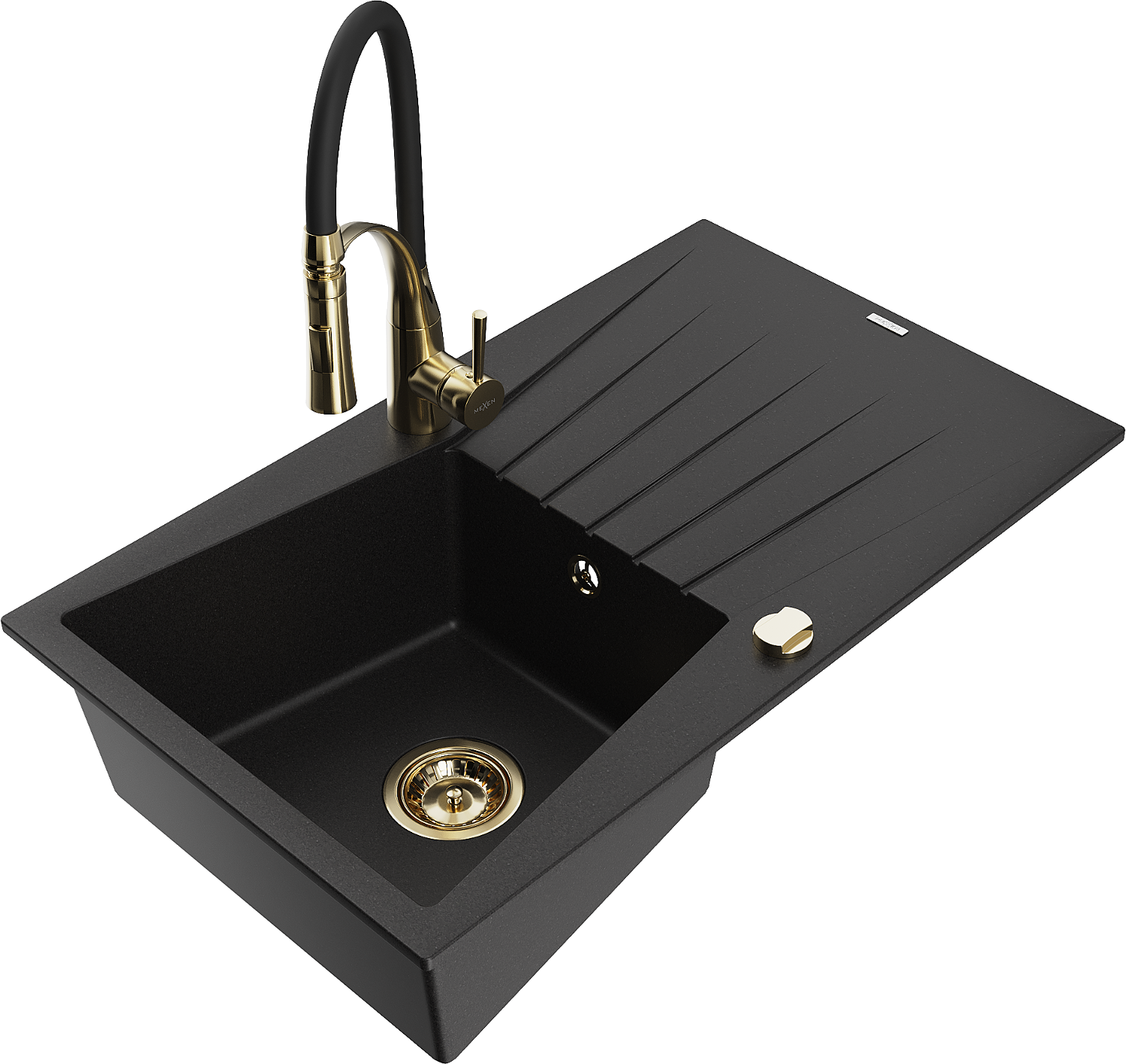 Mexen Cesar granitový dřez 1-komorový s odkapávačem a kuchyňskou baterií Aster, černý - 6514-77-73450-57-G