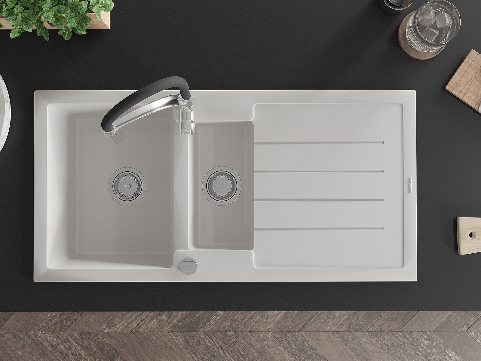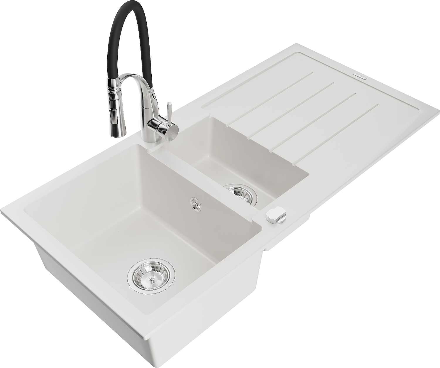 Mexen Andres granitový dřez 1,5-komorový s odkapávačem a kuchyňskou baterií Aster, bílý - 6515-20-73450-07