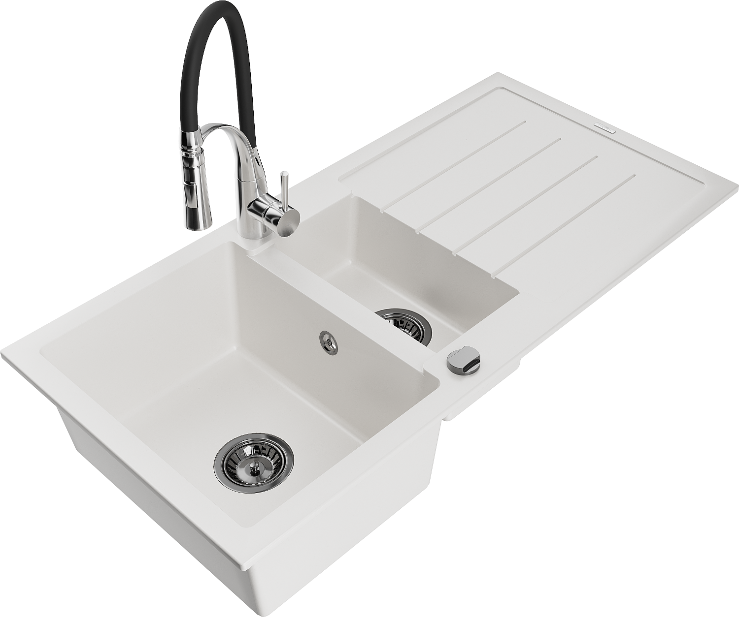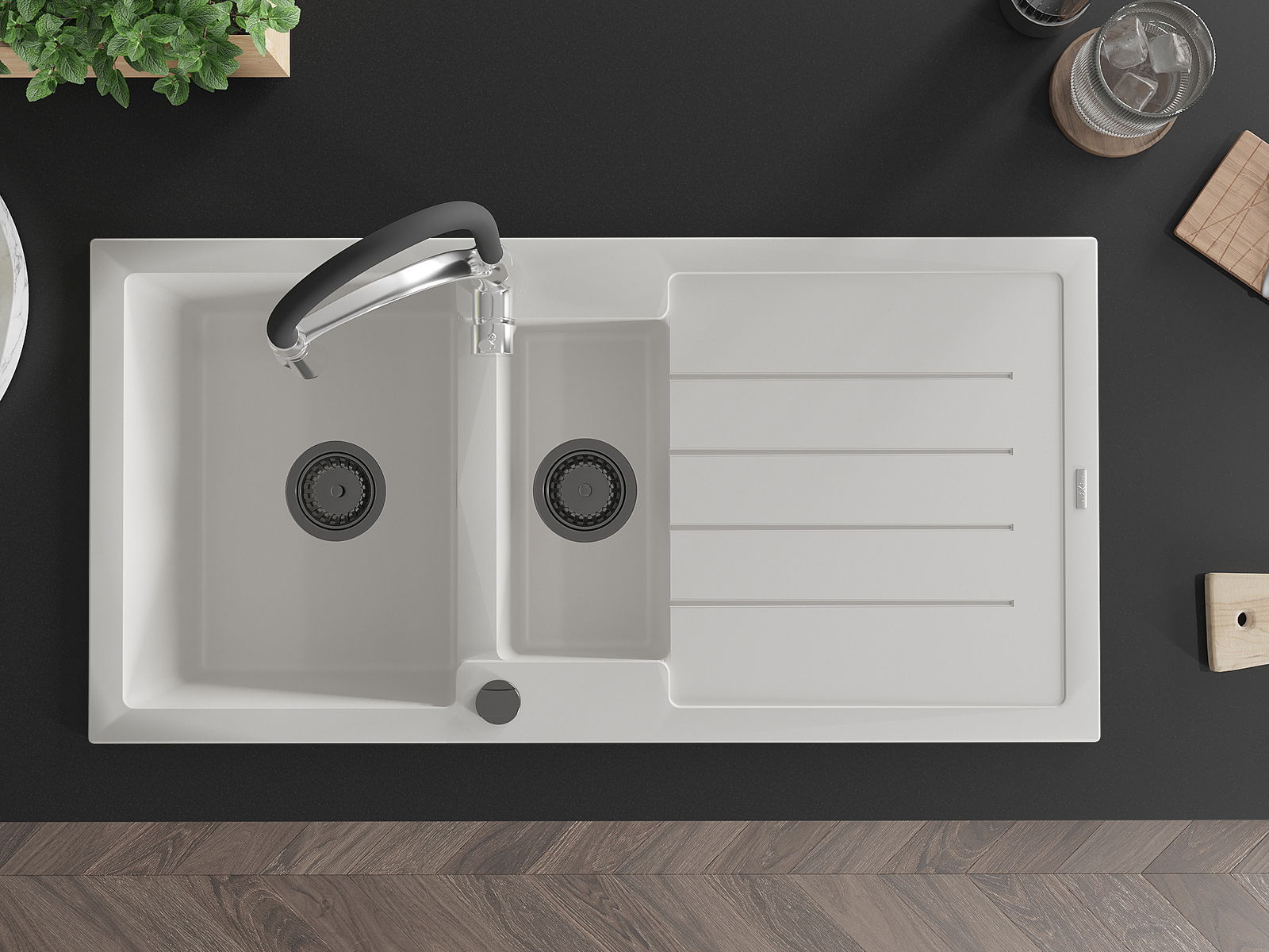 Mexen Andres granitový dřez 1,5 komorový s odkapávačem a kuchyňskou baterií Aster, bílý - 6515-20-73450-07-B