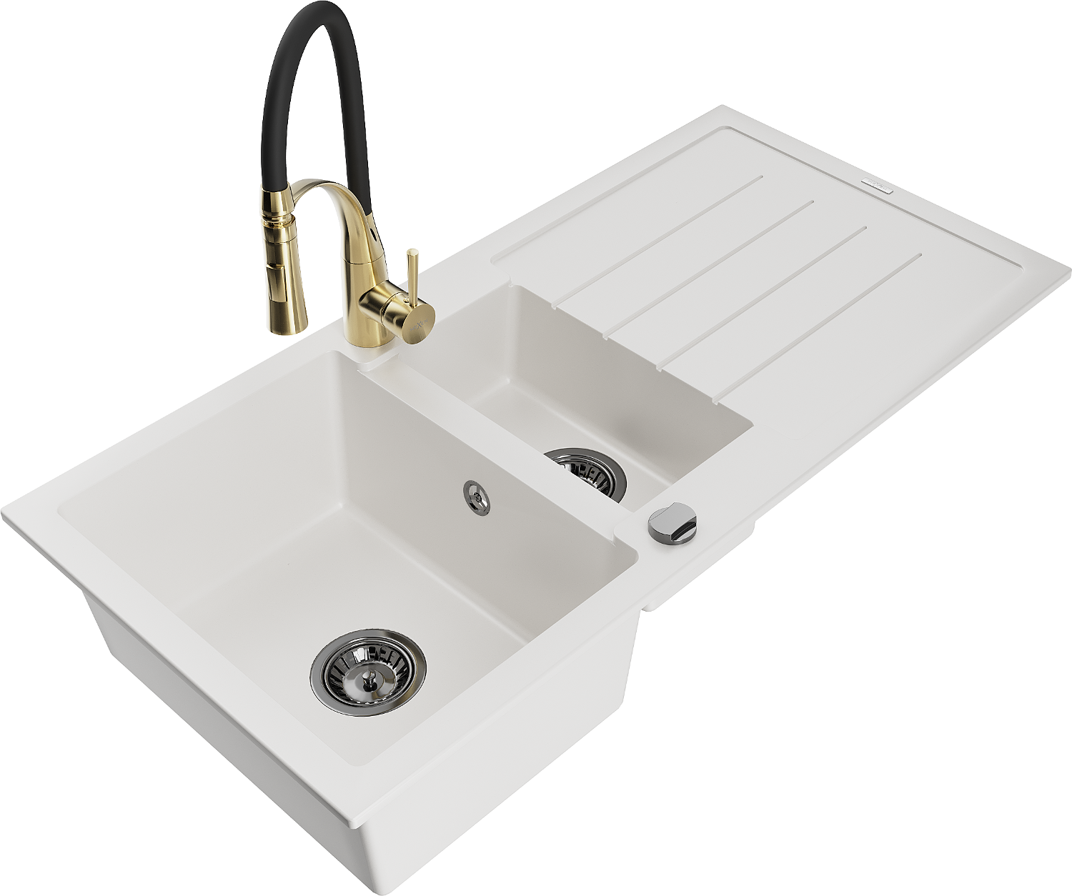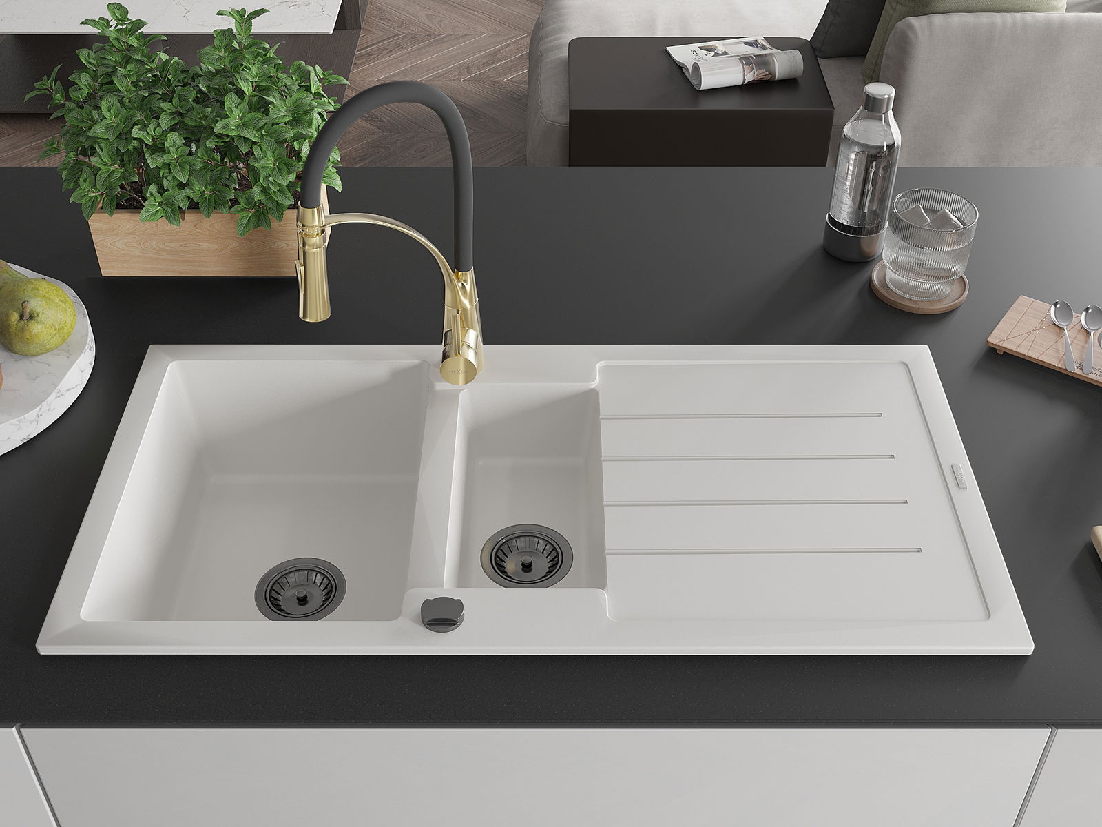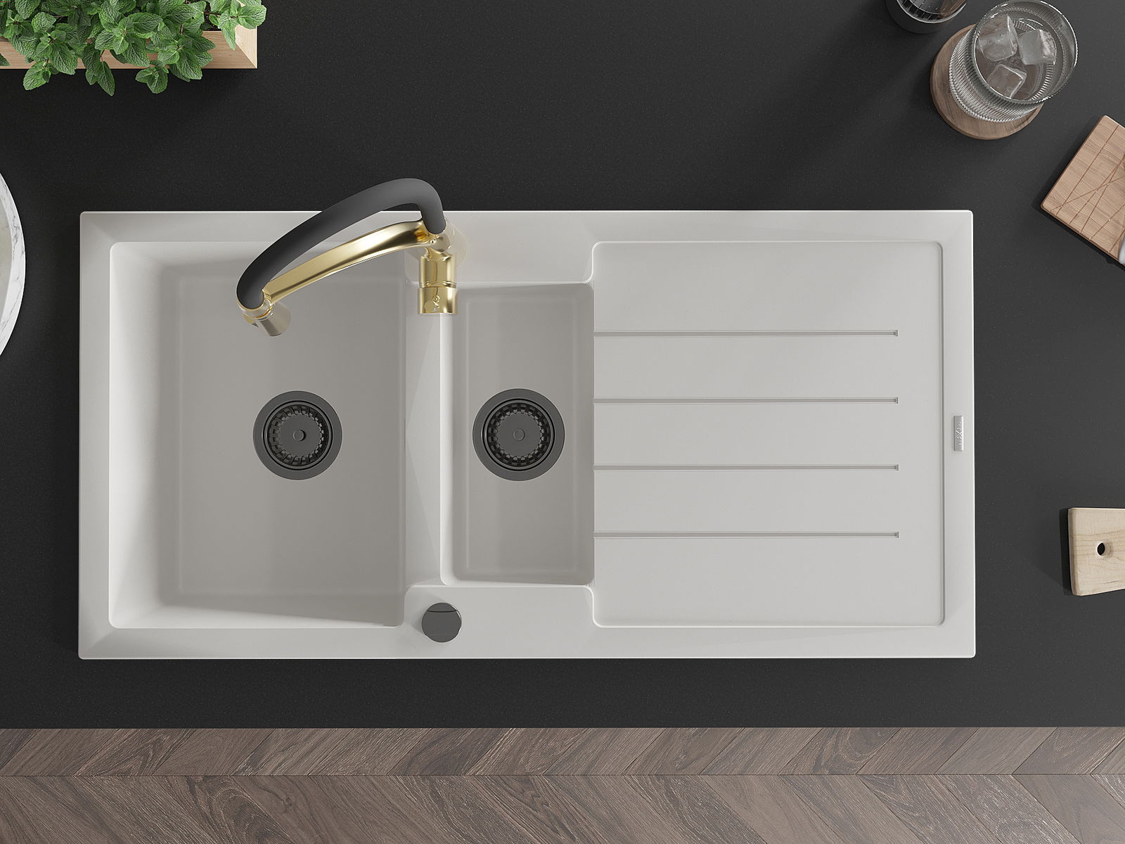 Mexen Andres granitový dřez 1,5-komorový s odkapávačem a kuchyňskou baterií Aster, bílý - 6515-20-73450-57-B