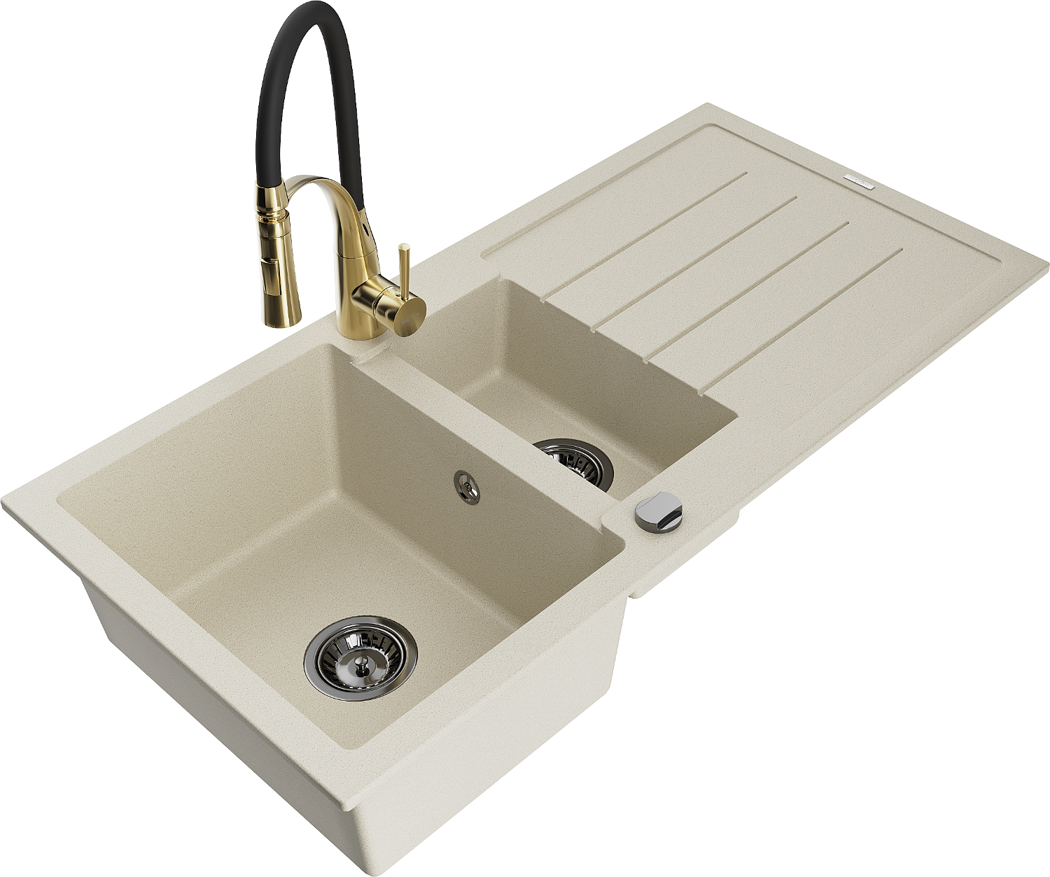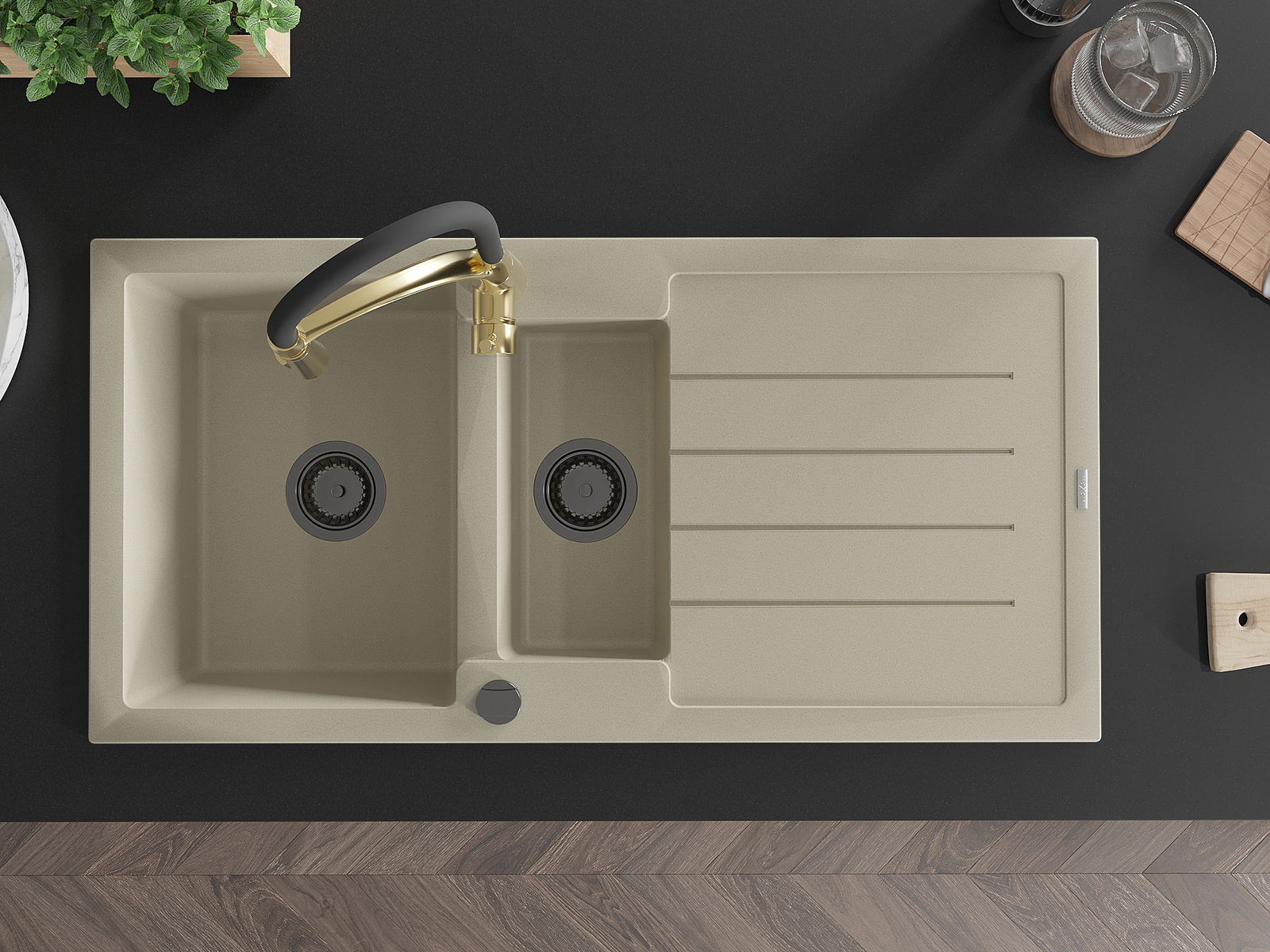 Mexen Andres granitový dřez 1,5-komorový s odkapávačem a kuchyňskou baterií Aster, béžový - 6515-69-73450-57-B