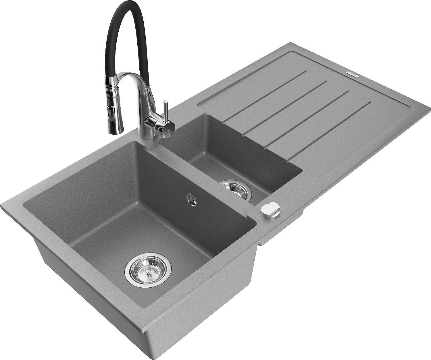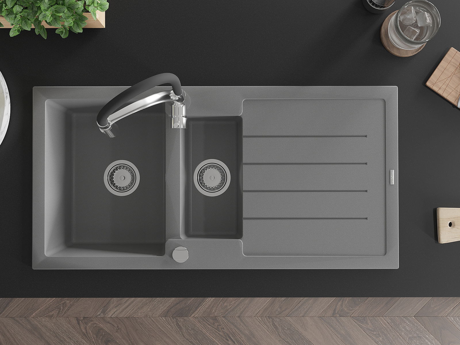 Mexen Andres granitový dřez 1,5-komorový s odkapávačem a kuchyňskou baterií Aster, šedý - 6515-71-73450-07