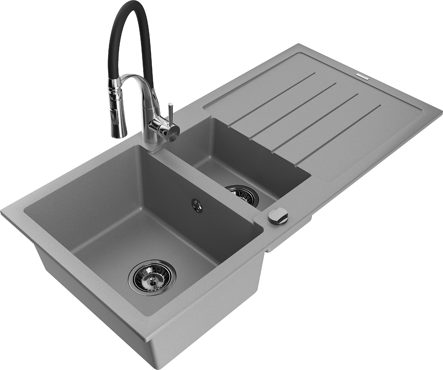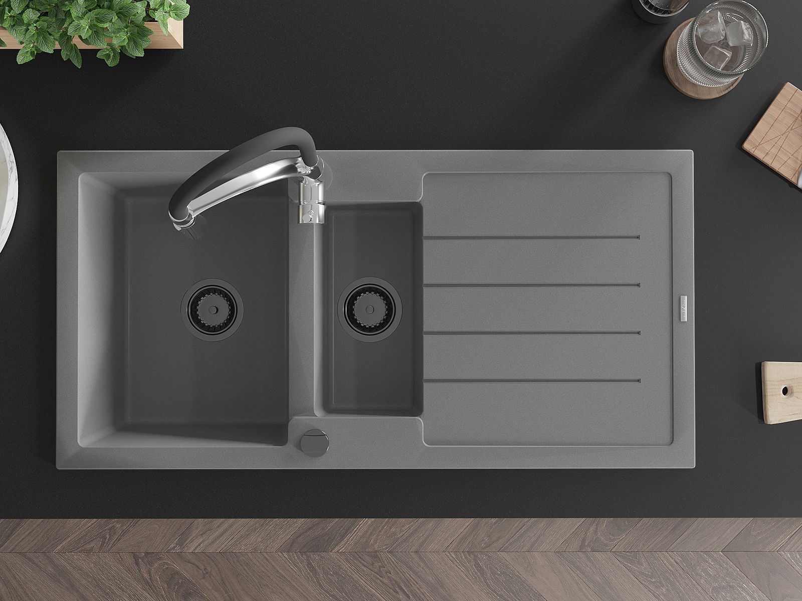 Mexen Andres granitový dřez 1,5-komorový s odkapávačem a kuchyňskou baterií Aster, šedý - 6515-71-73450-07-B