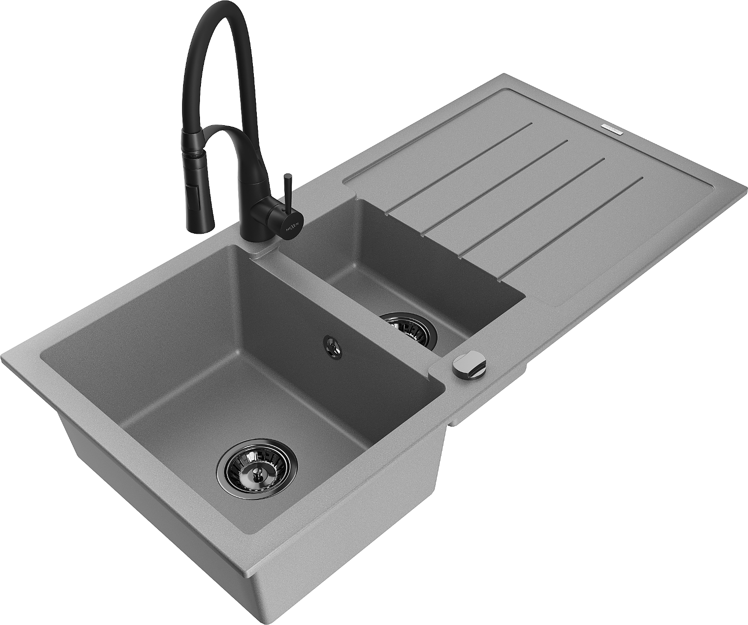 Mexen Andres žulový dřez 1,5-komorový s odkapávačem a kuchyňskou baterií Aster, šedý - 6515-71-73450-70-B