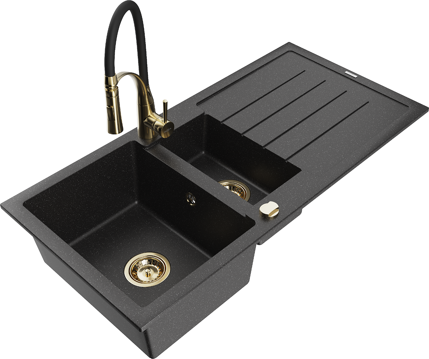 Mexen Andres granitový dřez 1,5-komorový s odkapávačem a kuchyňskou baterií Aster, černý/stříbrný - 6515-73-73450-57-G