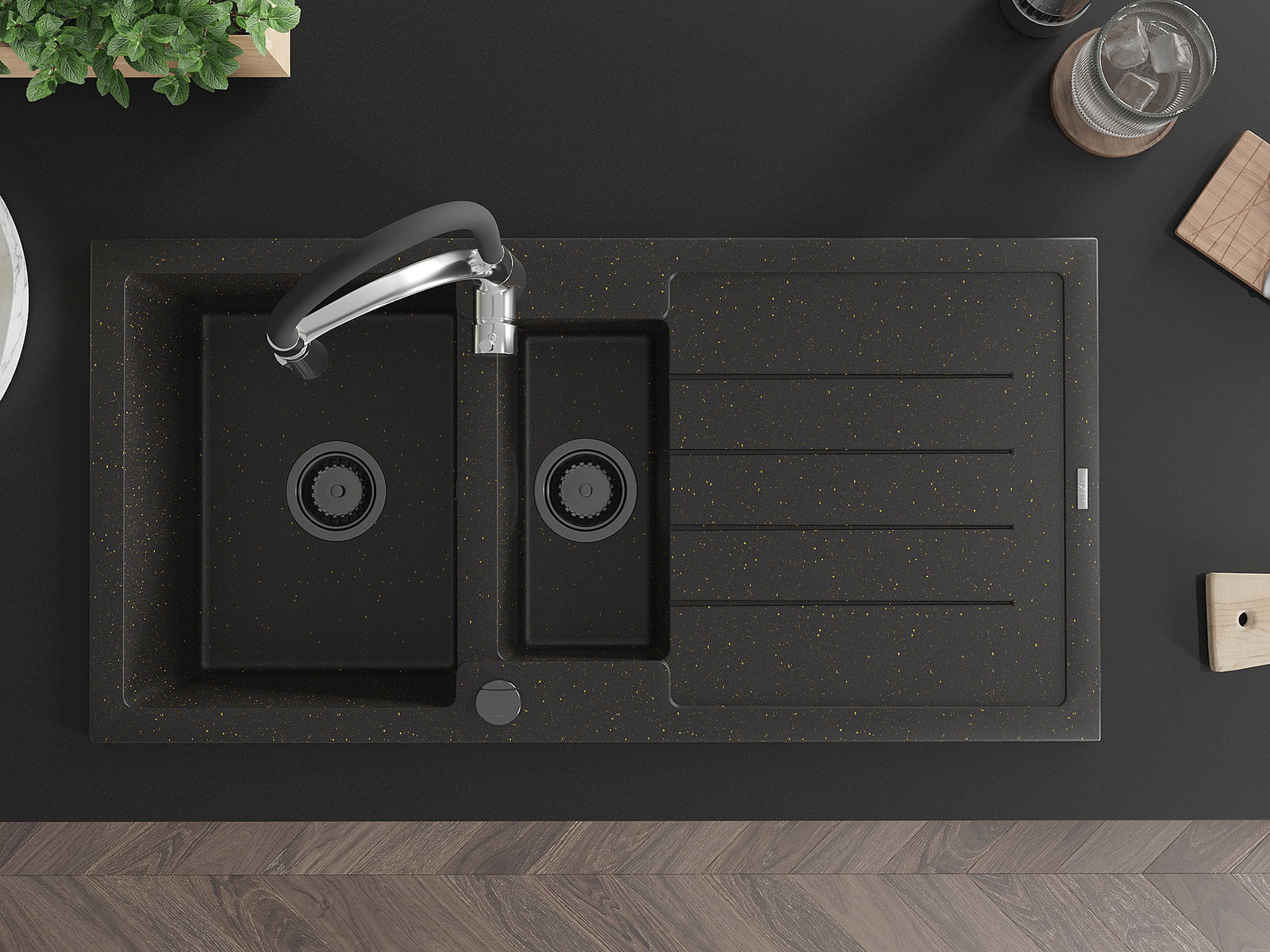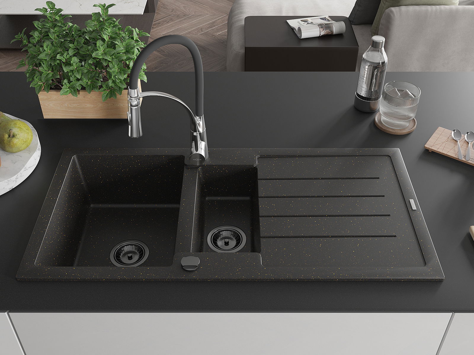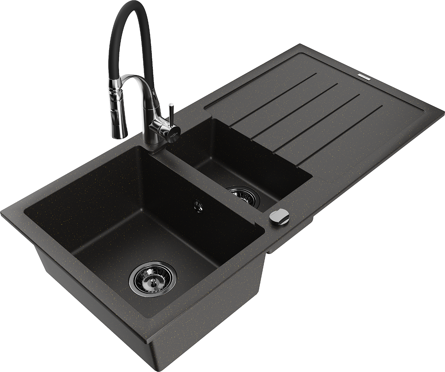 Mexen Andres granitový dřez 1,5-komorový s odkapem a kuchyňskou baterií Aster, černý/zlatý metalik - 6515-75-73450-07-B