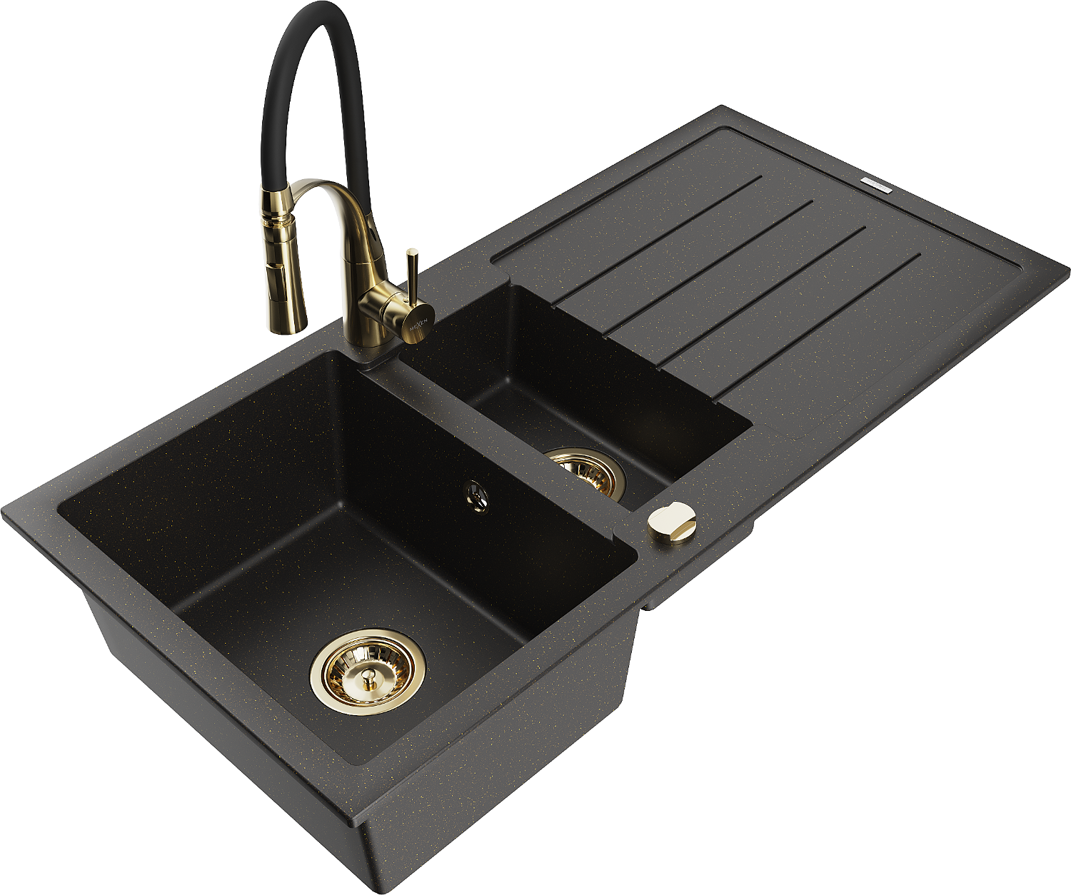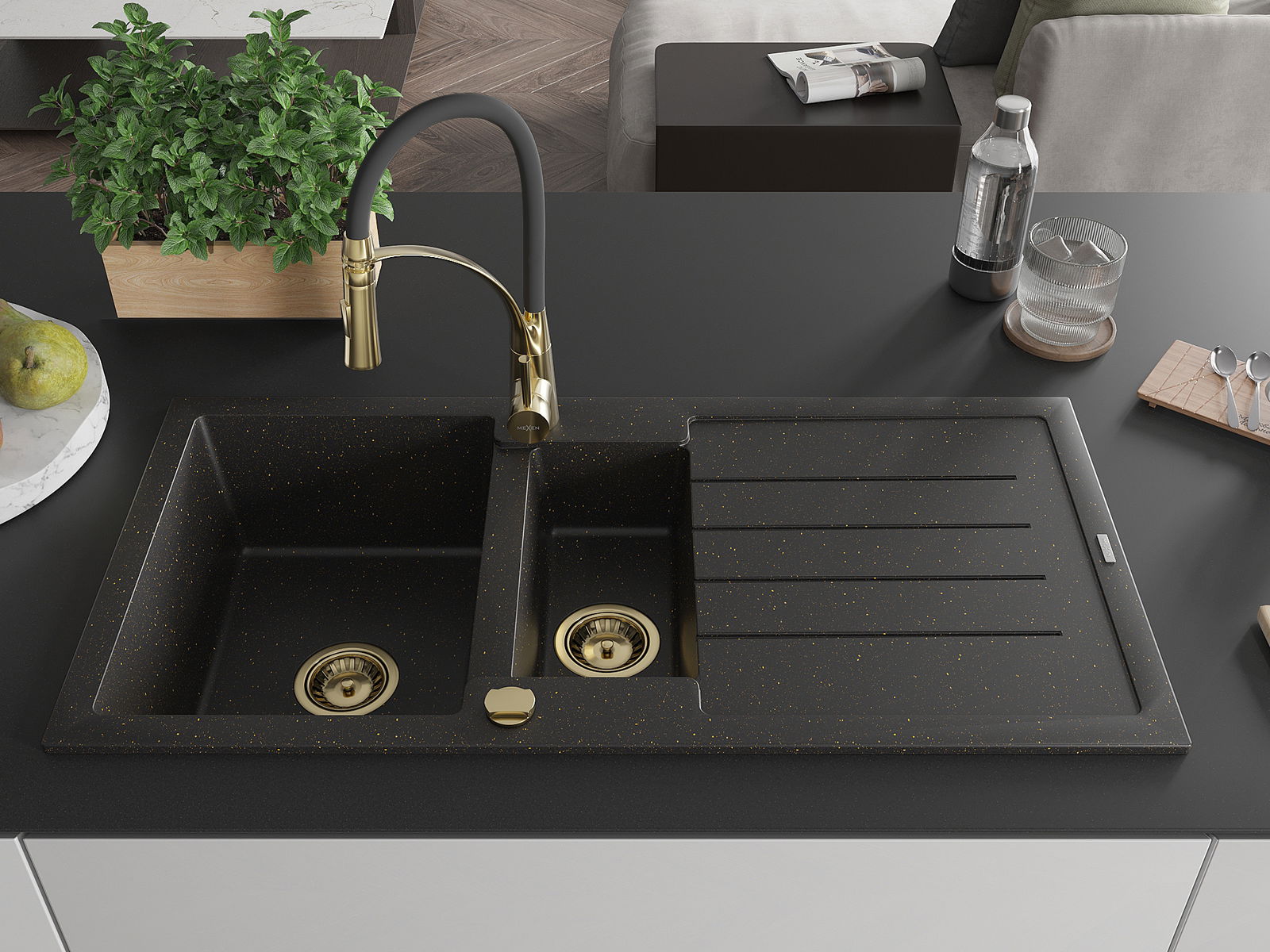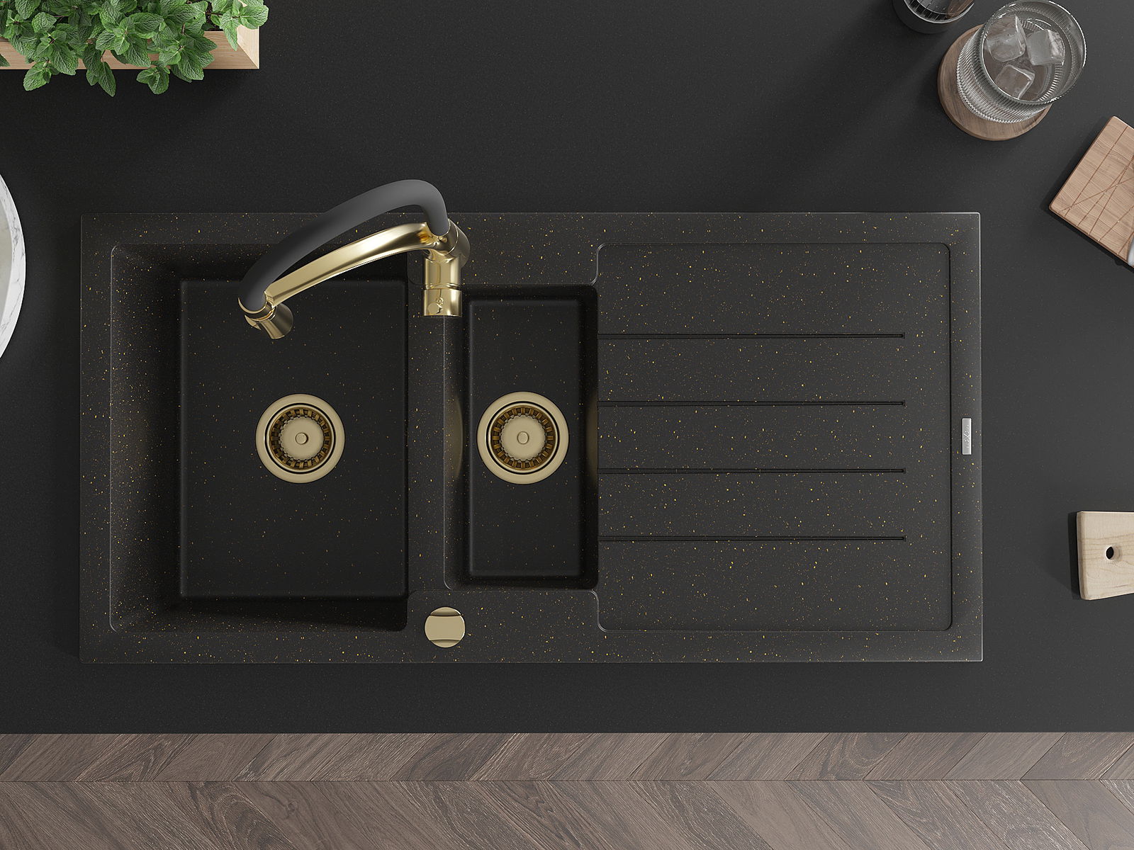Mexen Andres granitový dřez 1,5-komorový s odkapávačem a kuchyňskou baterií Aster, černý/zlatý metalik
