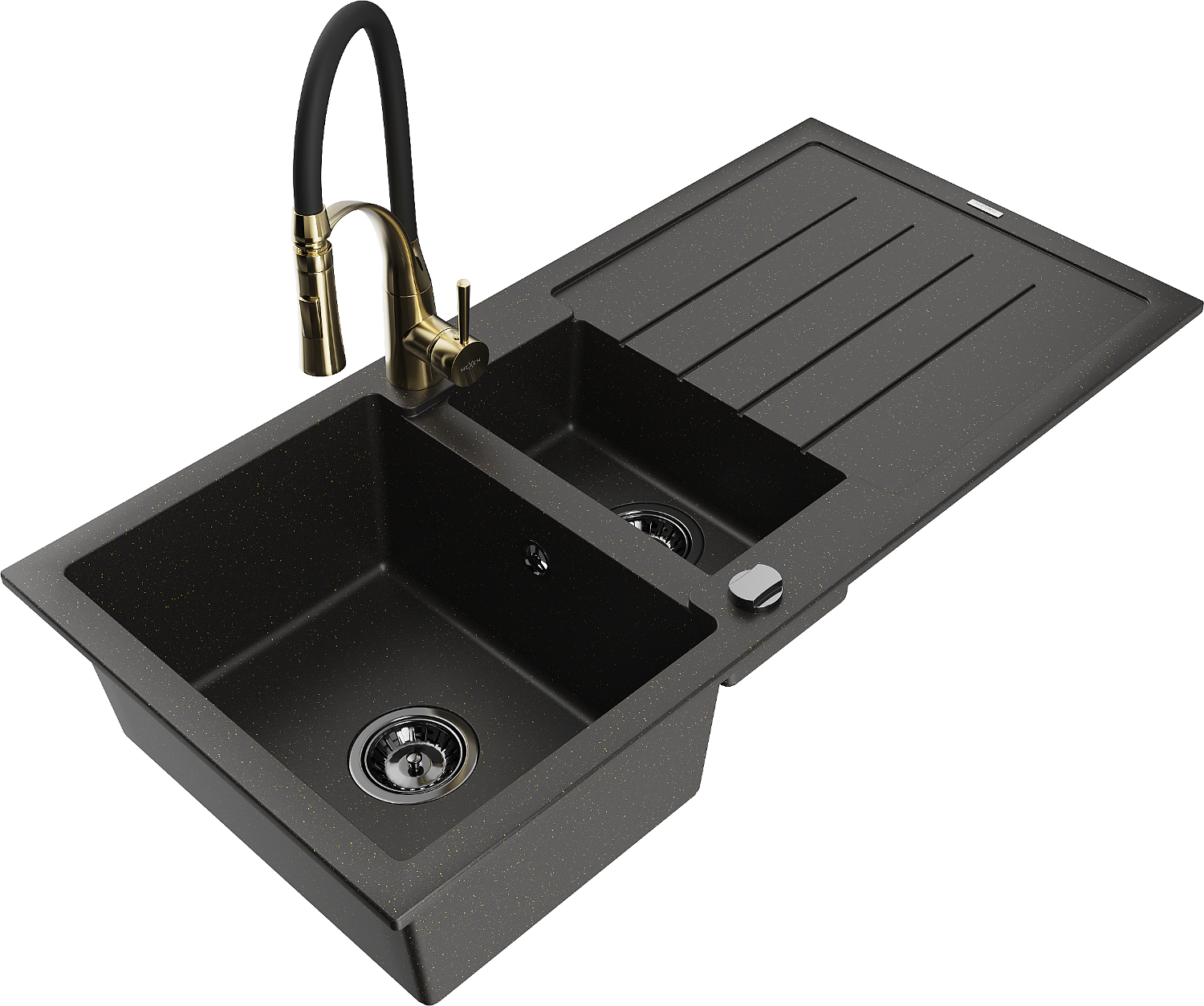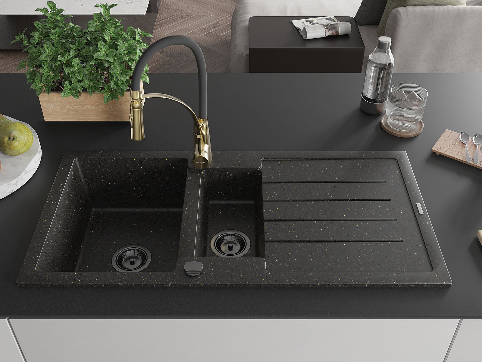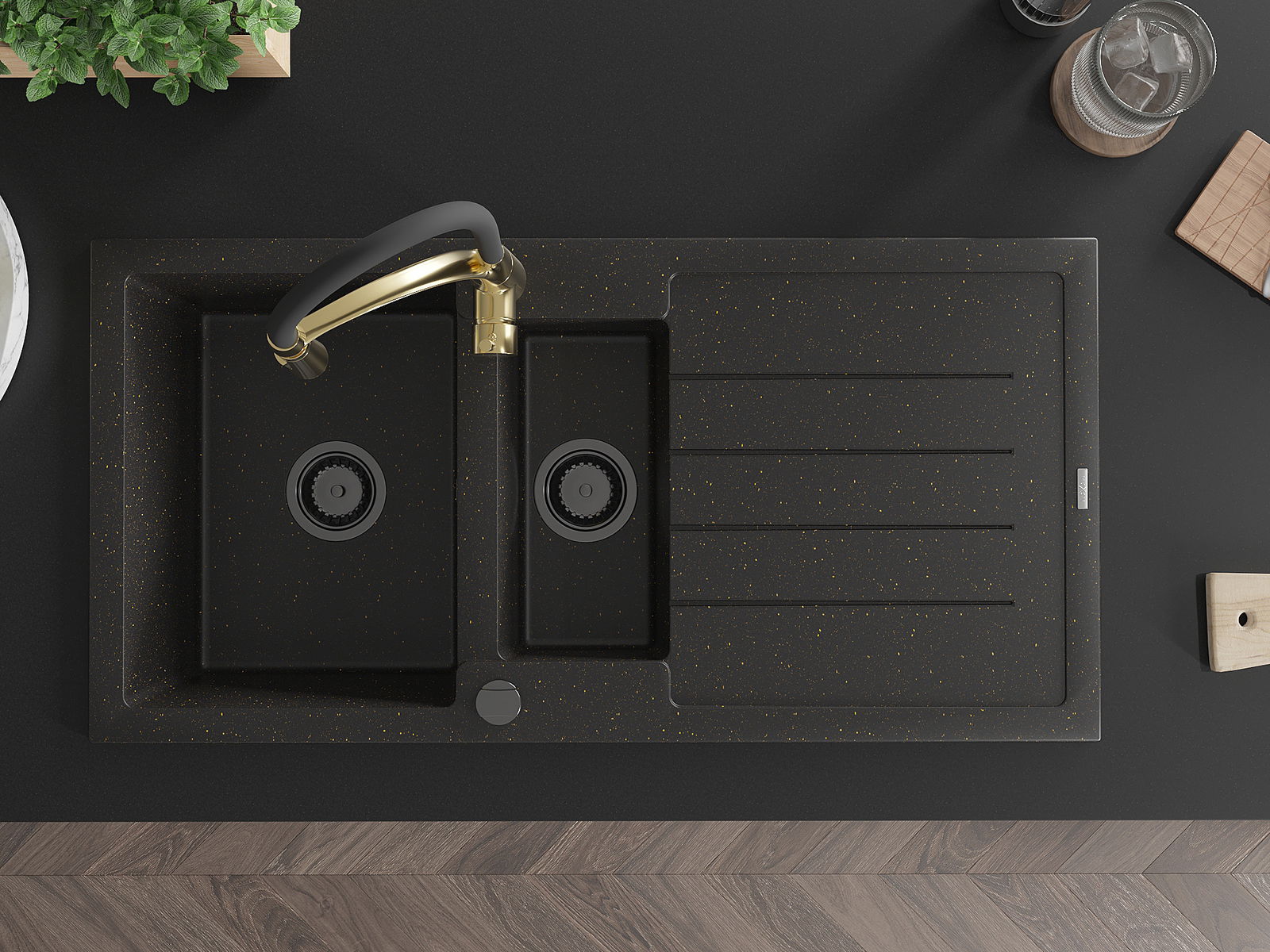Mexen Andres granitový dřez 1,5-komorový s odkapávačem a kuchyňskou baterií Aster, černý/zlatý metalik - 6515-75-73450-57-B