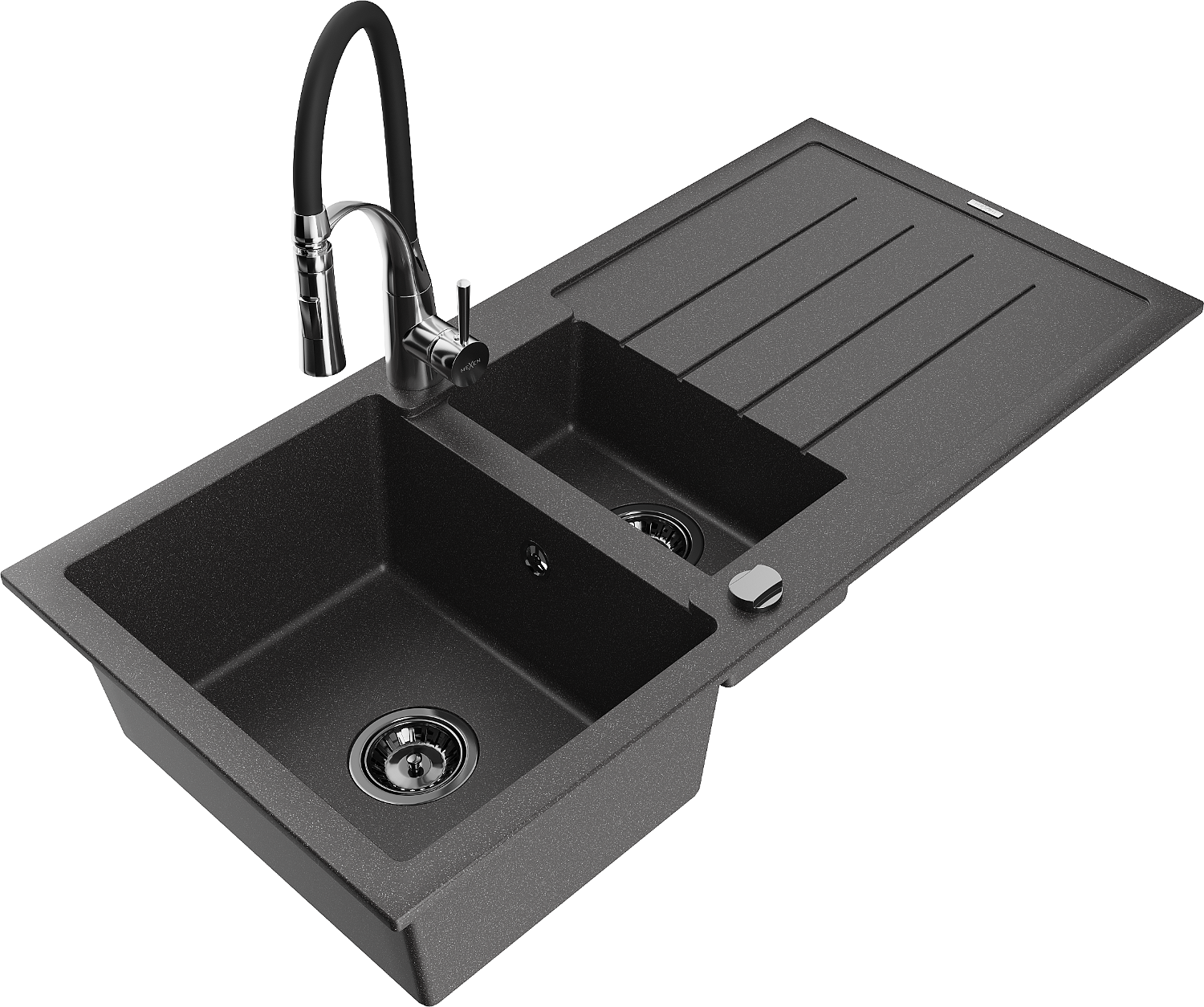 Mexen Andres žulový dřez 1,5-komorový s odkapávačem a kuchyňskou baterií Aster, černý skvrnitý - 6515-76-73450-07-B