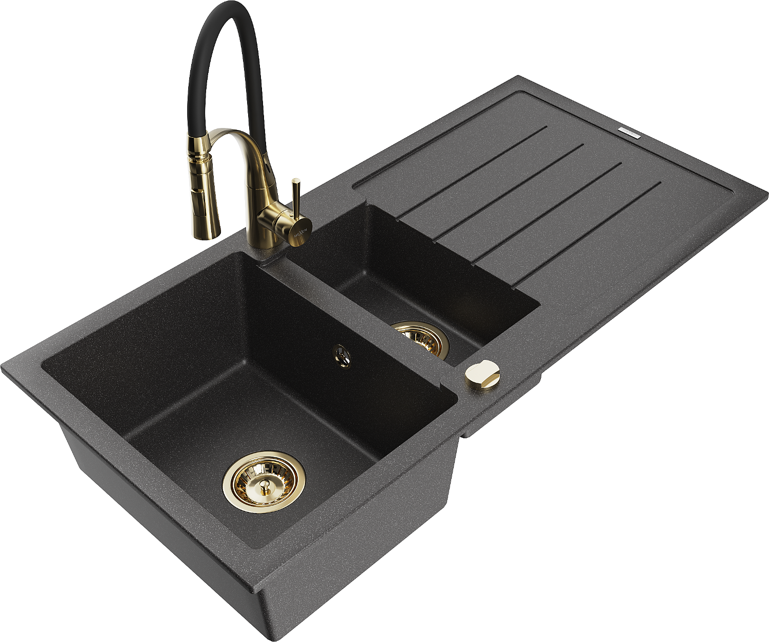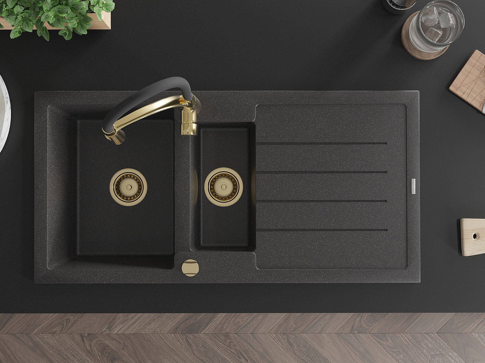 Mexen Andres žulový dřez 1,5-komorový s odkapávačem a kuchyňskou baterií Aster, černý skvrnitý - 6515-76-73450-57-G