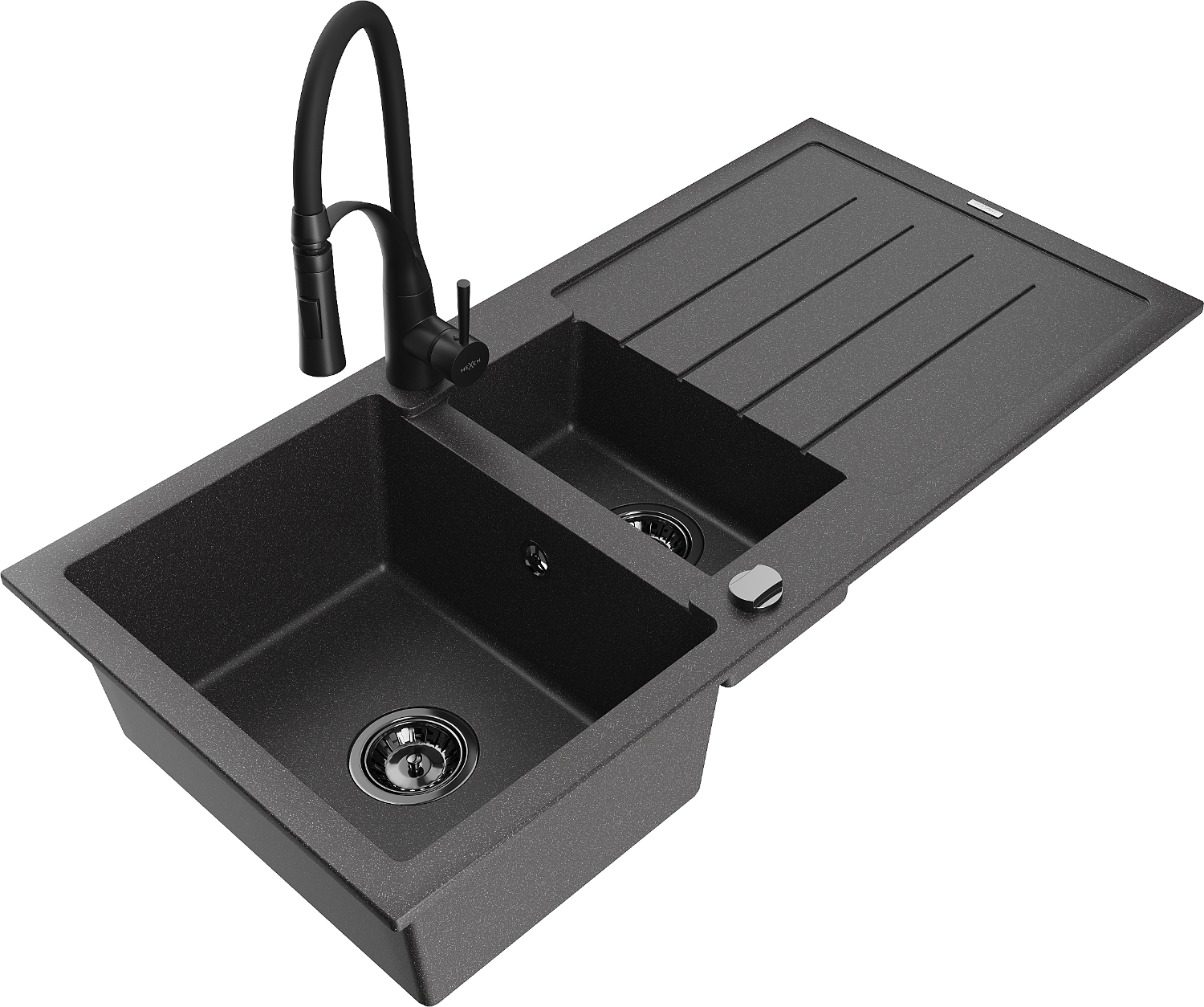 Mexen Andres granitový dřez 1,5-komorový s odkapávačem a kuchyňskou baterií Aster, černý žíhaný - 6515-76-73450-70-B