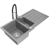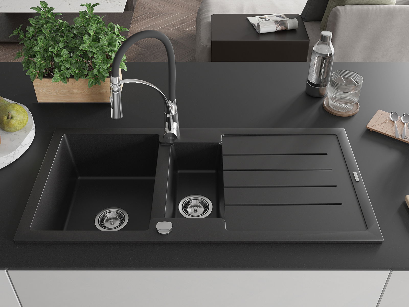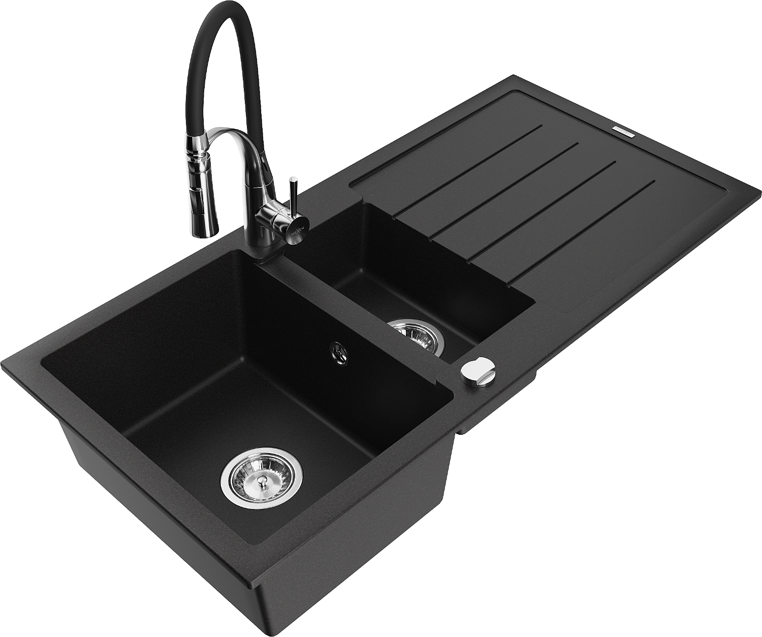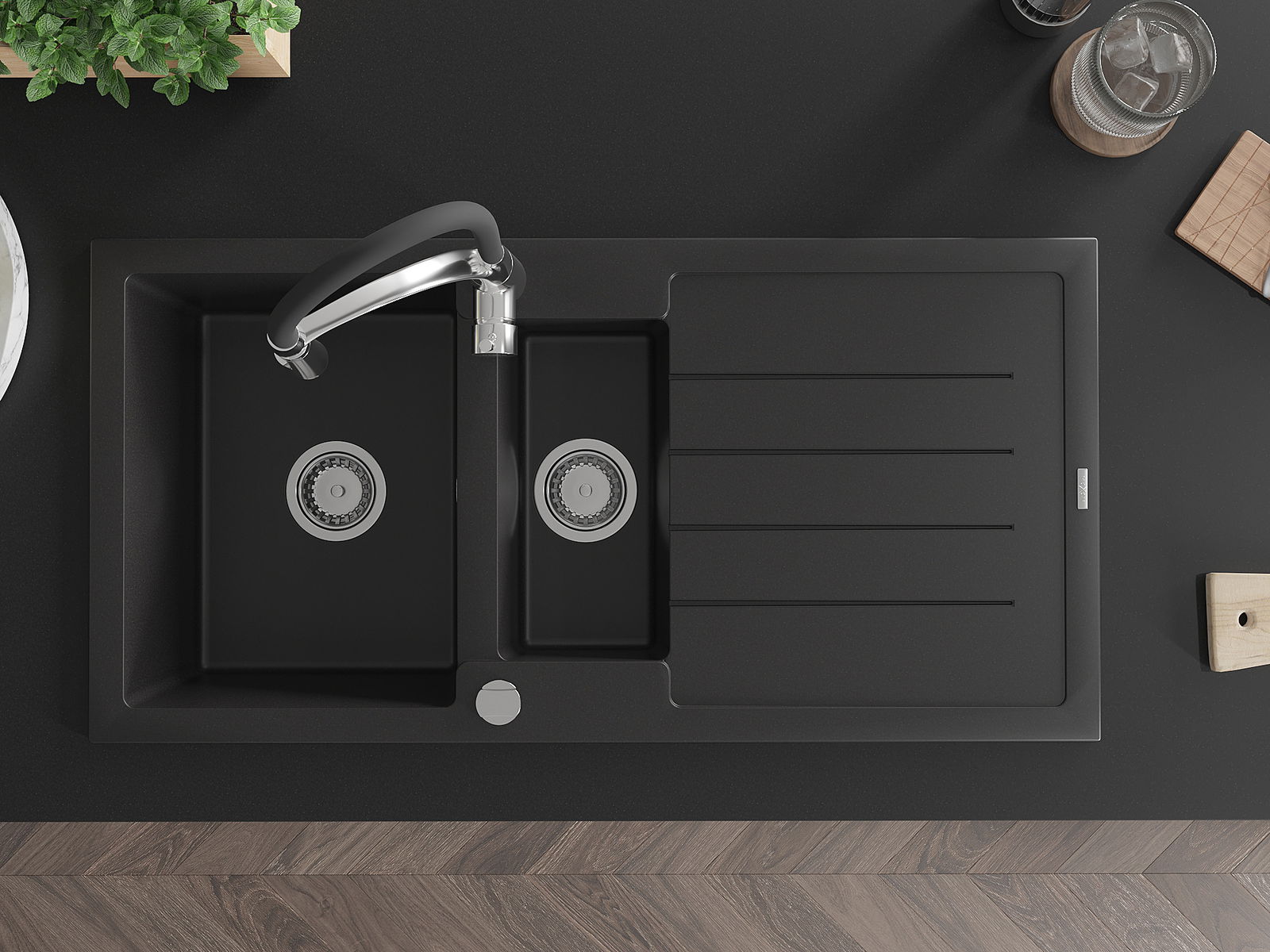 Mexen Andres granitový dřez 1,5-komorový s odkapávačem a kuchyňskou baterií Aster, černý - 6515-77-73450-07