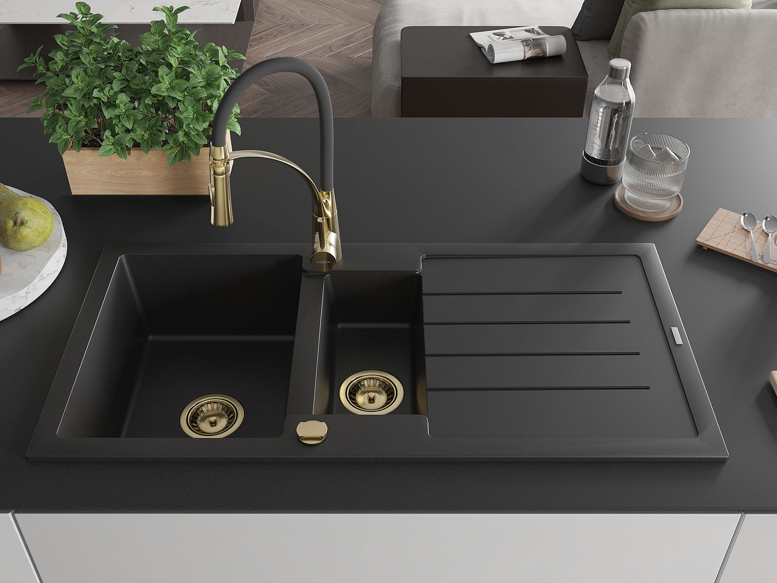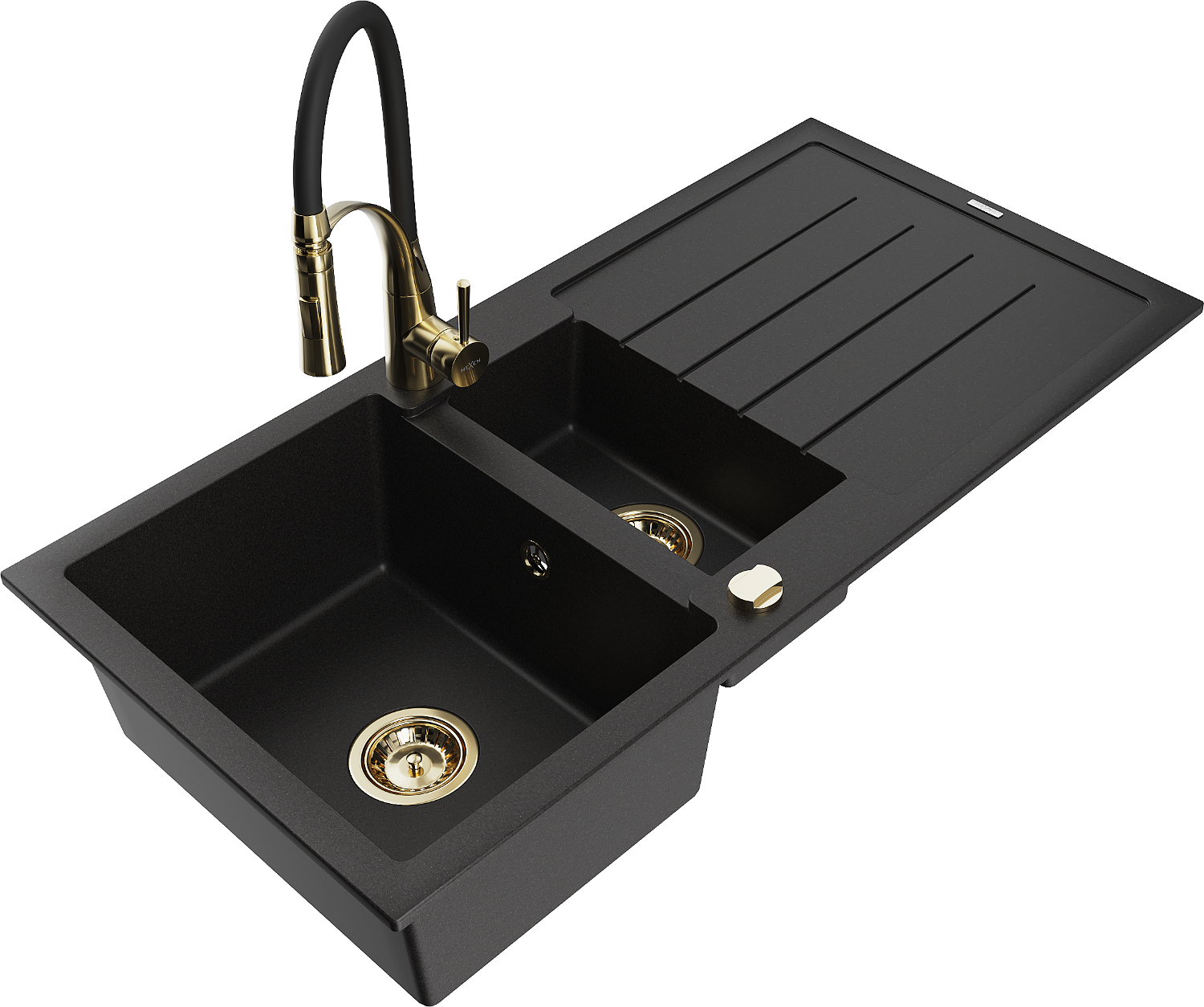 Mexen Andres granitový dřez 1,5-komorový s odkapávačem a kuchyňskou baterií Aster, černý - 6515-77-73450-57-G