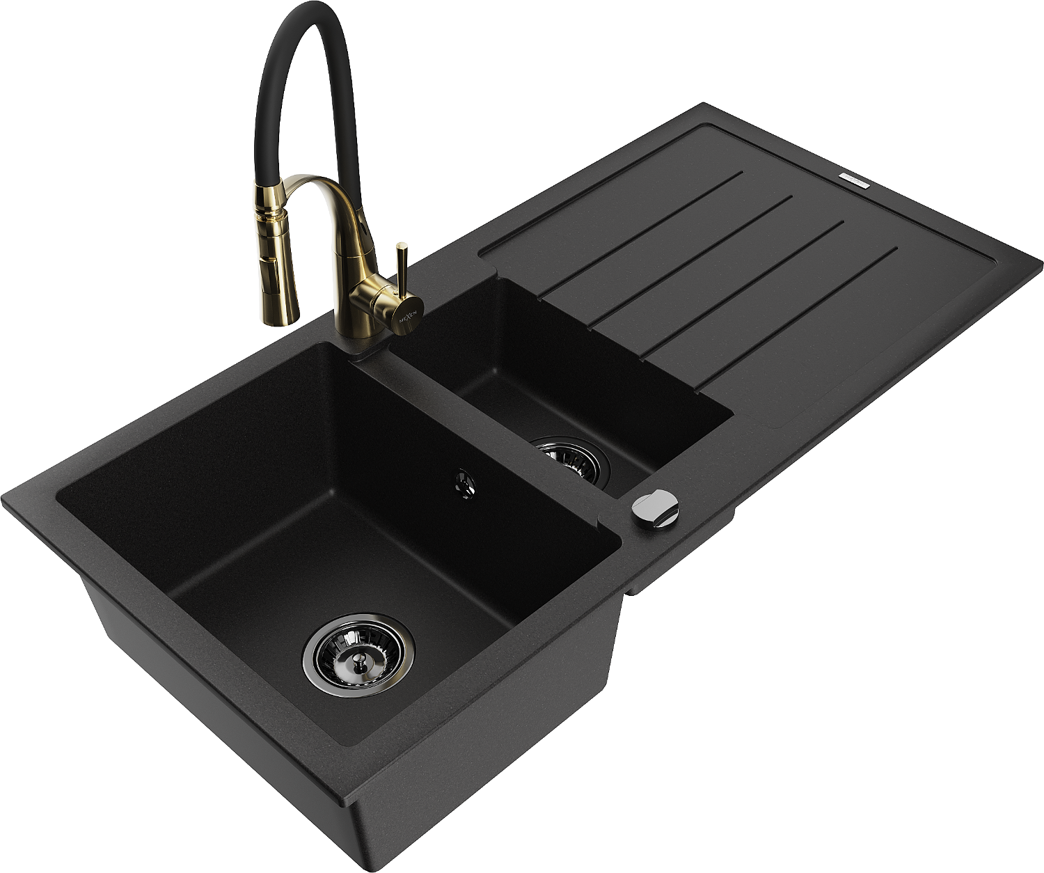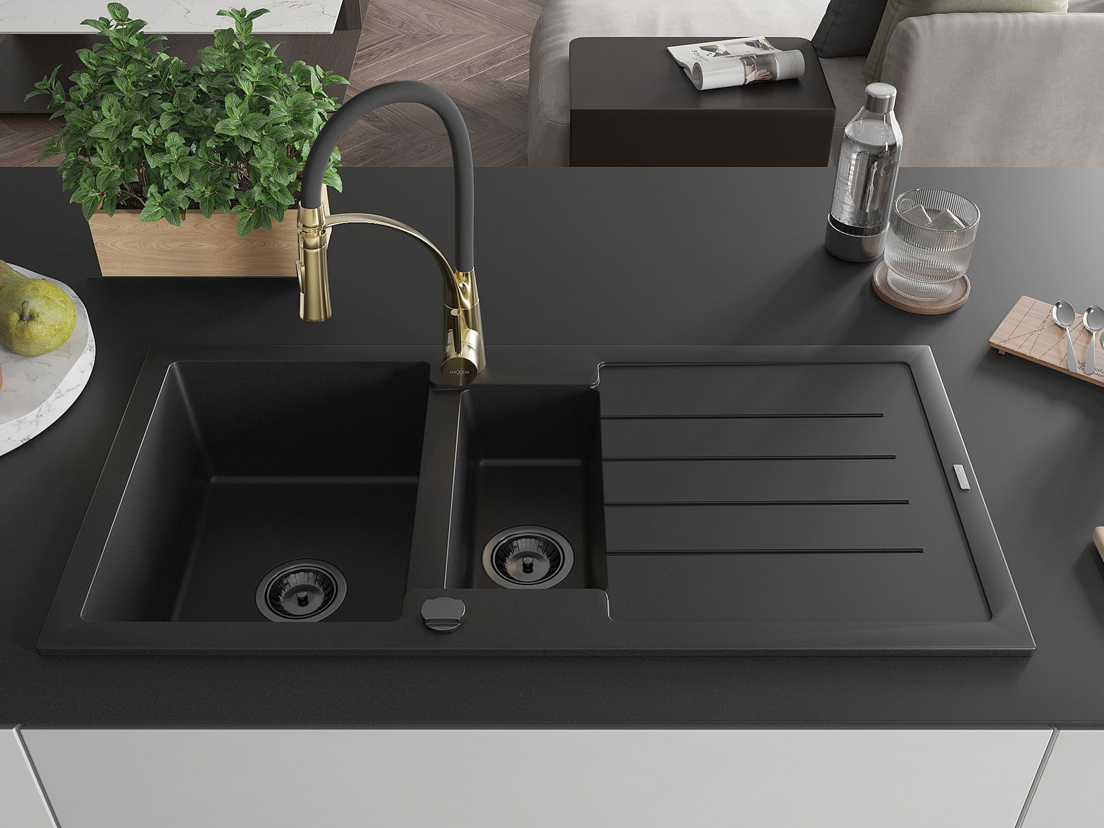 Mexen Andres granitový dřez 1,5-komorový s odkapávačem a kuchyňskou baterií Aster, černý - 6515-77-73450-57-B