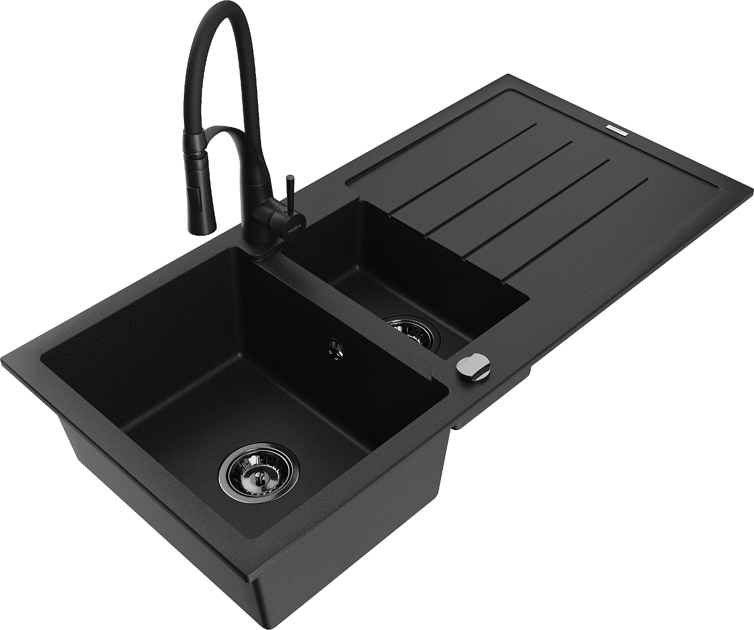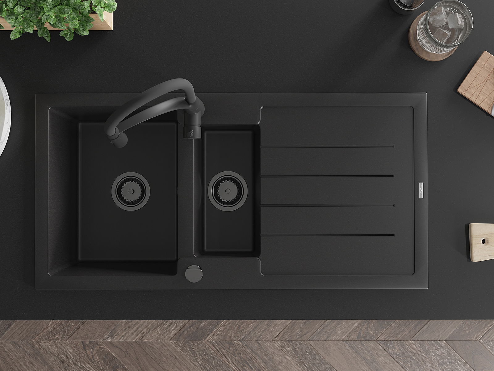 Mexen Andres žulový dřez 1,5-komorový s odkapávačem a kuchyňskou baterií Aster, černý - 6515-77-73450-70-B