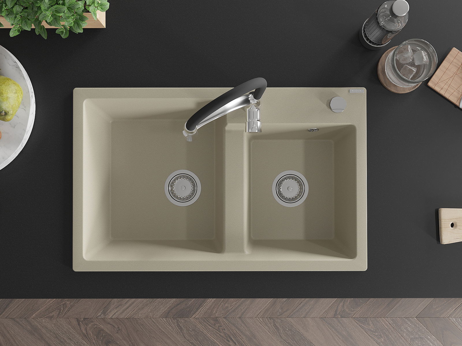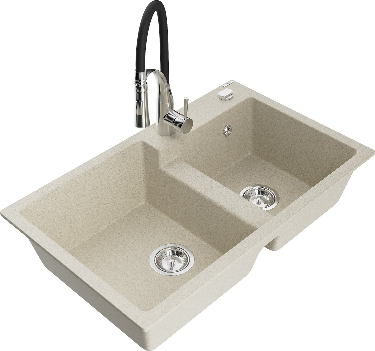 Mexen Tomas dřez žulový 2-komorový s kuchyňskou baterií Aster, béžový - 6516-69-73450-07