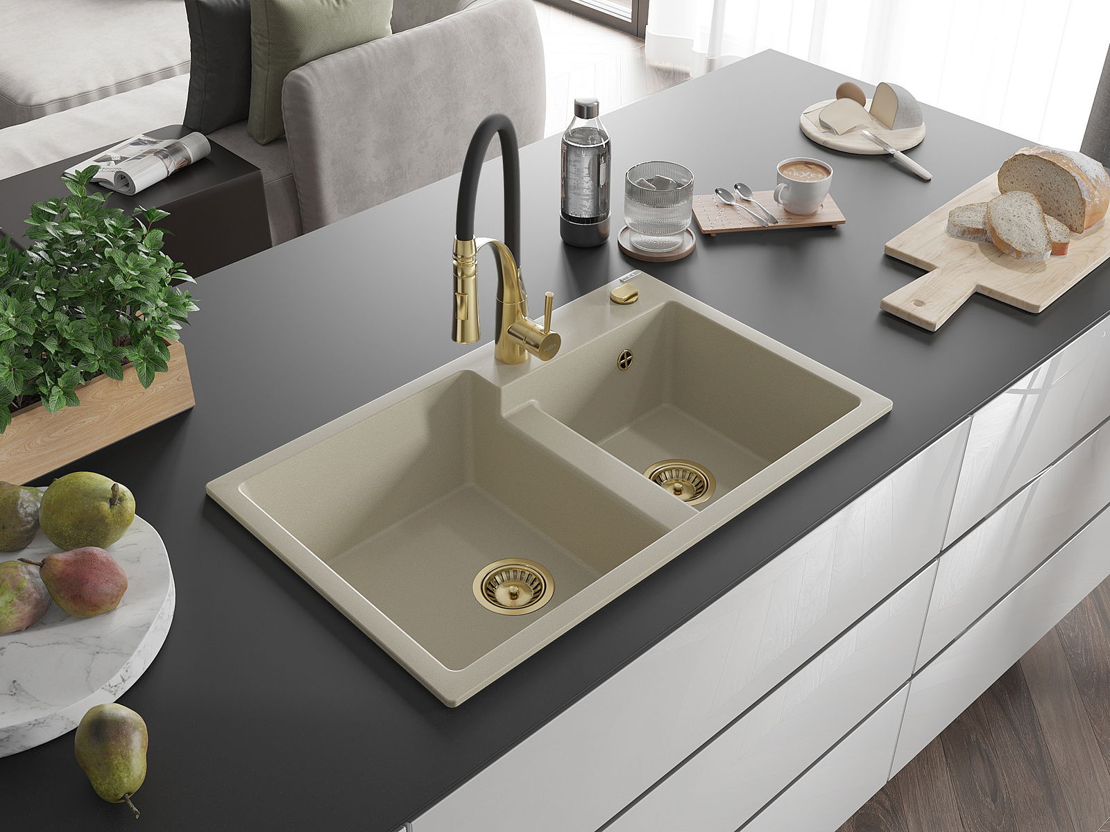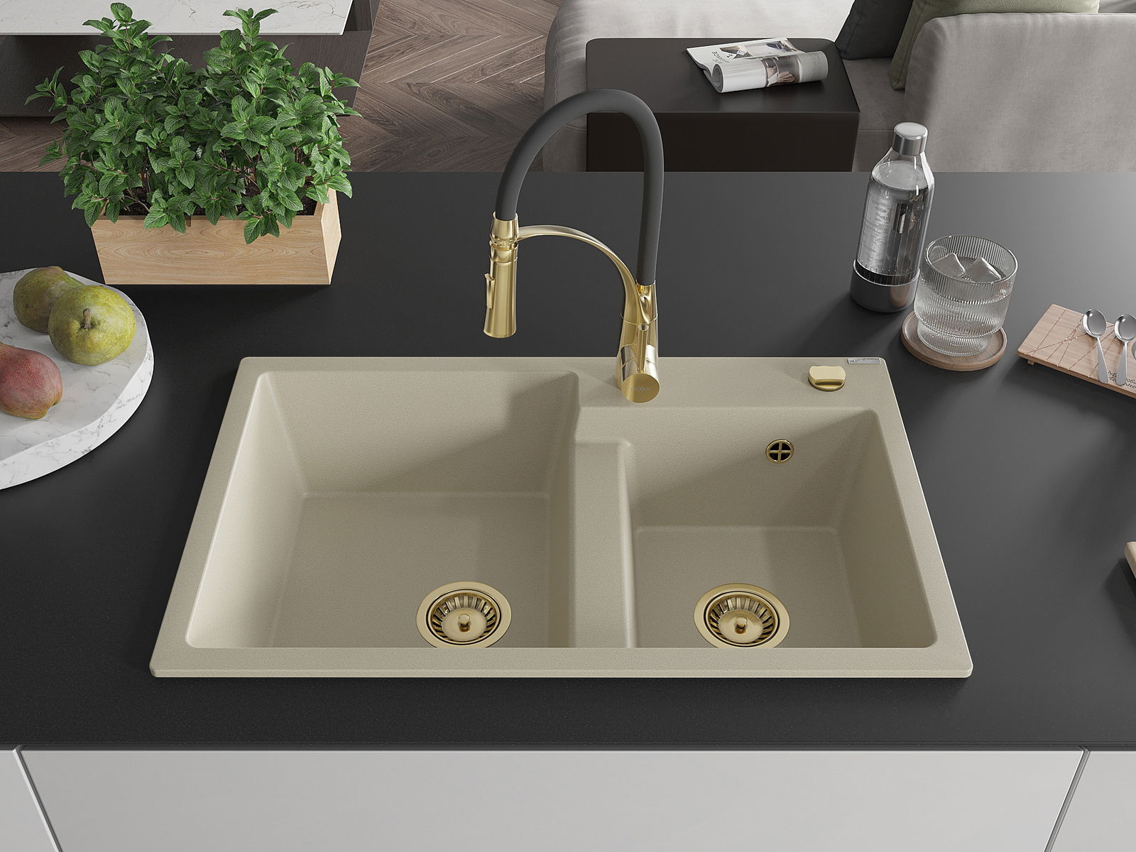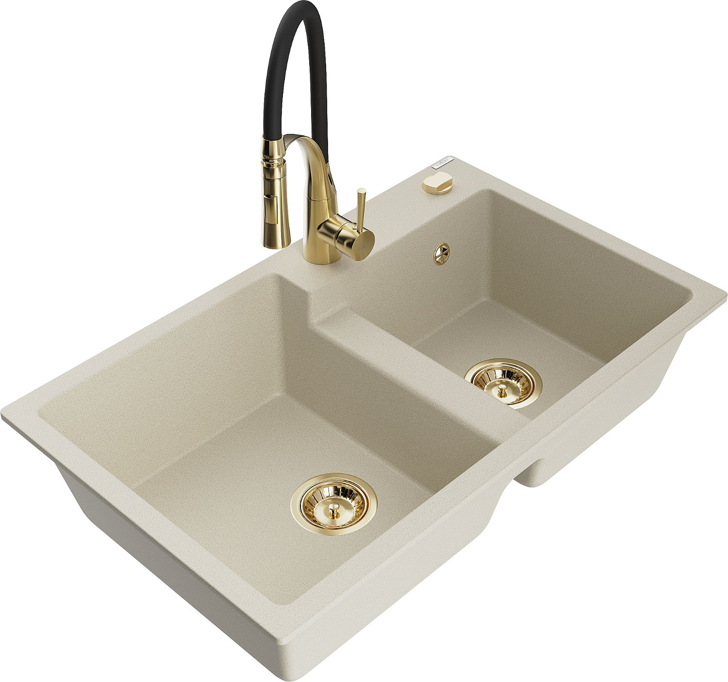 Mexen Tomas dvoukomorový žulový dřez s kuchyňskou baterií Aster, béžový - 6516-69-73450-57-G