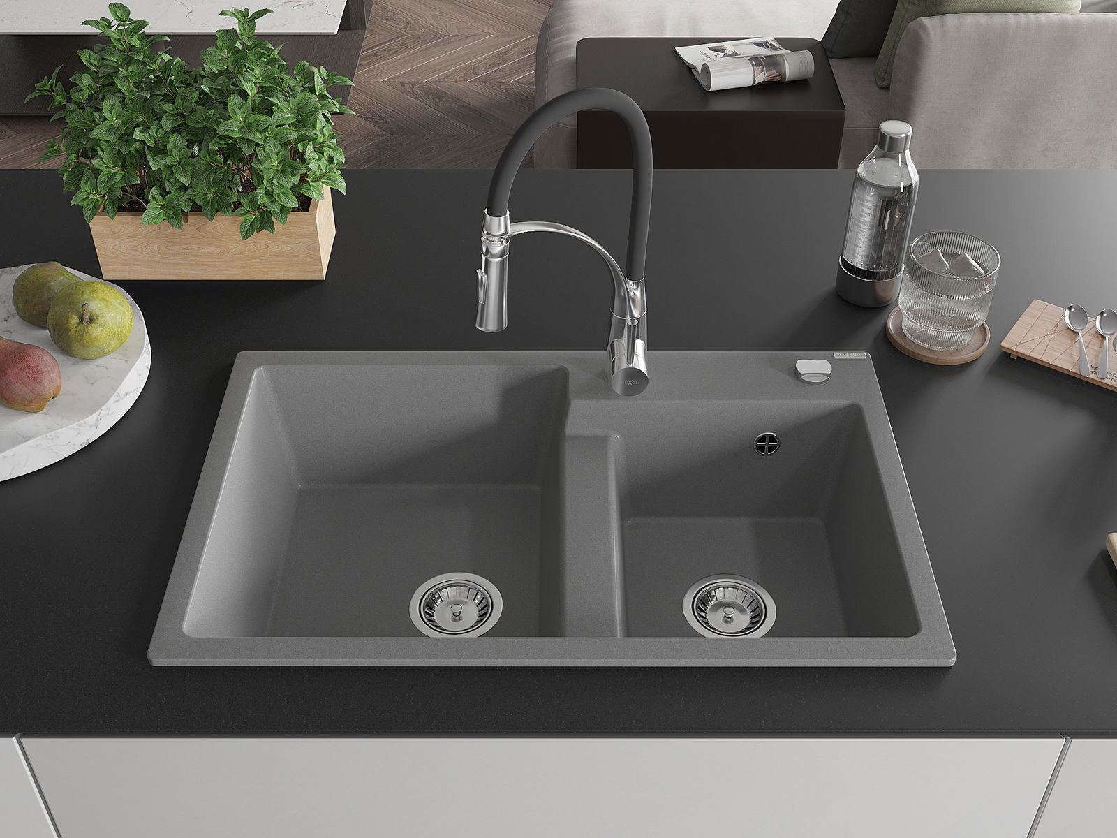 Dřez má předfrézovaný otvor o průměru 35 mm k samostatnému proražení. Může být použit například k montáži dávkovače na tekutinu, který eliminuje přítomnost plastových lahví v kuchyni a dodá jí elegantní finiš.
