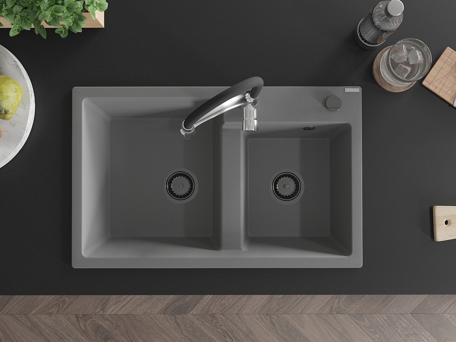 Mexen Tomas granitový dřez 2-komorový s kuchyňskou baterií Aster, šedý - 6516-71-73450-07-B