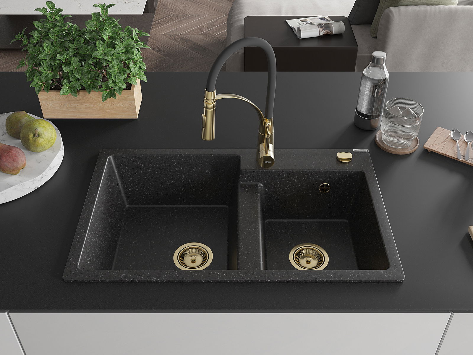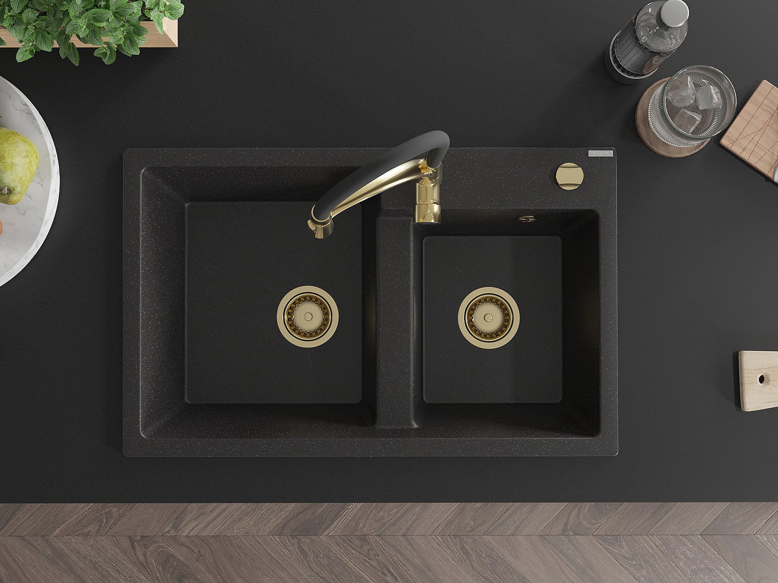 Mexen Tomas žulový dřez 2-komorový s kuchyňskou baterií Aster, černý/stříbrný metalik - 6516-73-73450-57-G